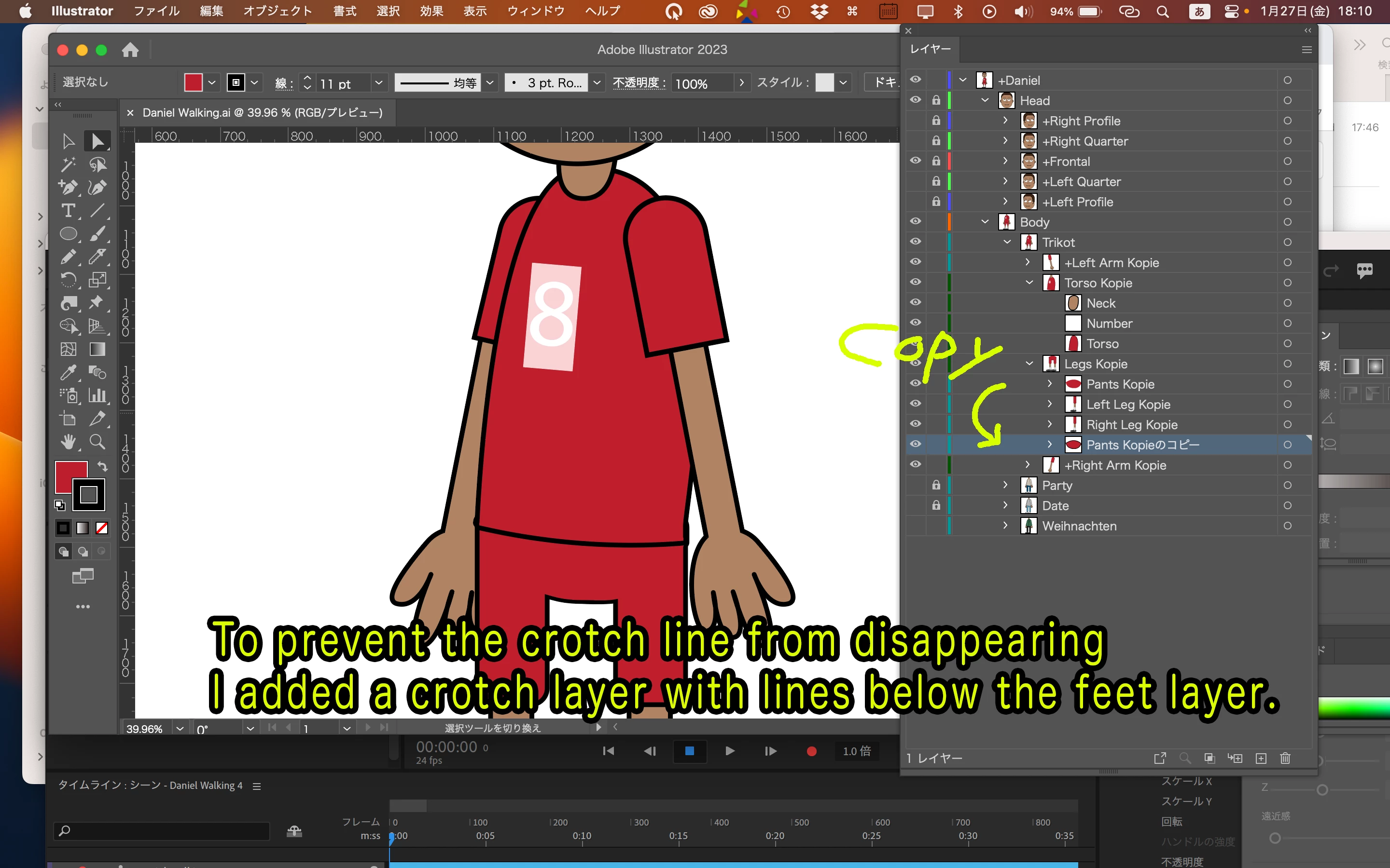 2. On every layer: The line of the pants is misplaced while walking. Maybe it's the layers structure in Illustrator and the pants and legs need to be arranged differently?