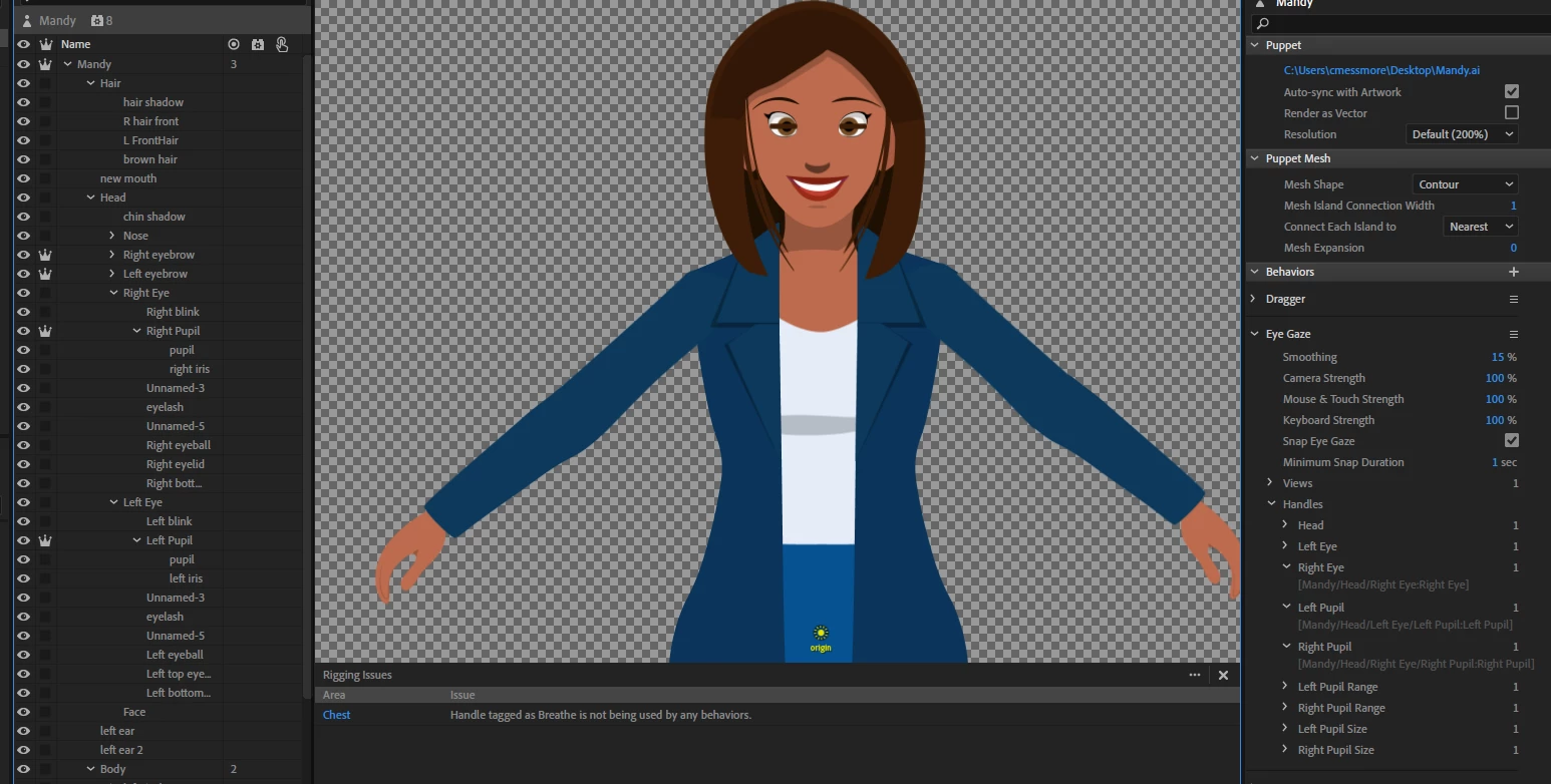 Or if you can export the puppet and share it with us via GoogleDrive, DripBox, Frame.io, etc., we can take a closer look.