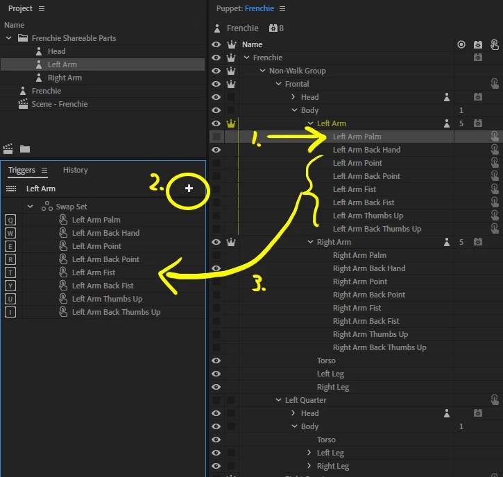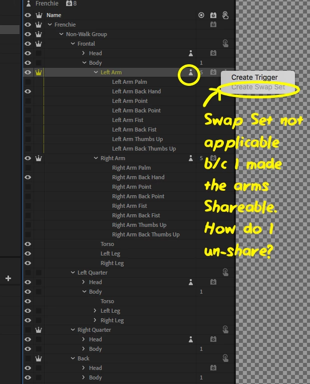 Eventually the triggers panel will probably supporting showing triggers from shared puppets within the current puppet so the first option above would do the same thing as creating the swap set first and then invoking make sharable, but we haven't reworked the triggers panel to support that yet.