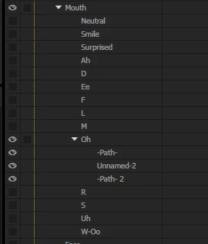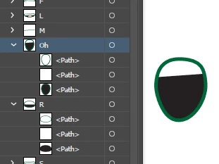 I've created a puppet that imports into Character Animator almost completely correctly, but the "Oh" shape for the mouth comes in as nested objects. Most all of the mouths I've set up using multiple vector objects, but this is the only mouth that doesn't come in as a single object. The image below shows the group structure for the Oh and the R shapes.