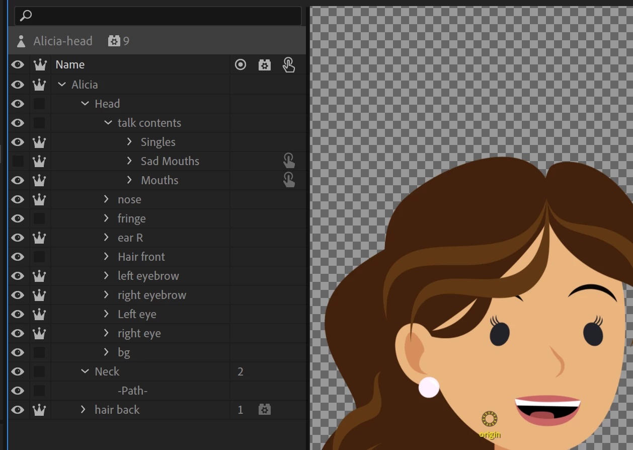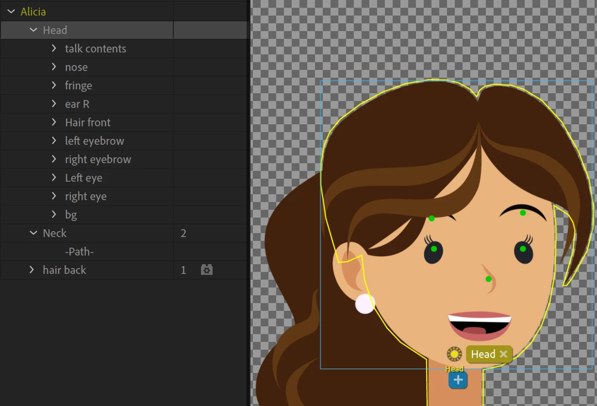 I have created this character, and everything is working well, apart from the mouth not moving in a similar way to the rest of the facial features when I use the parralax behaviour. I have a swap set setup with a lip sync set of happy mouths and sad mouths as well as some single mouths (smile, surprised, frown). I also noticed when I select the head group there are green dots over the eyes, eyeborws and nose, but not on the mouth.