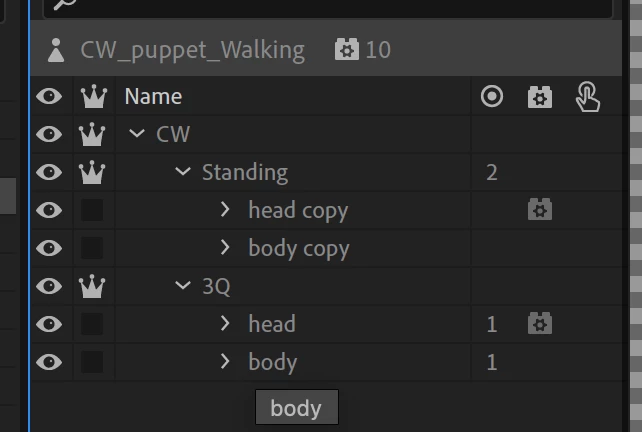 I've been following along with Okay Samurai's Character Animator tutorials, and am working on a two-pose puppet following the guide: a stationary and single-direction walk cycle. I can set up the walk cycle fine when it's the only one in the stack, but adding multiple views causes issues. I have tagged the three-quarter view with the profile tag, but I see both views simultaneously when I go to a scene. If I hide the visibility in the puppet rigging screen, that of course hides it in the preview, but looking at the sample characters (such as Okay Samurai's Eliza3View) that's not necessary. I assume there's something obvious I'm missing but following along the tutorial there's no apparent step.