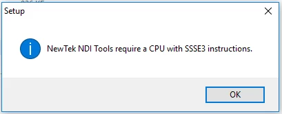 NewTek NDI Tools require a CPU with SSSE3 instructions.