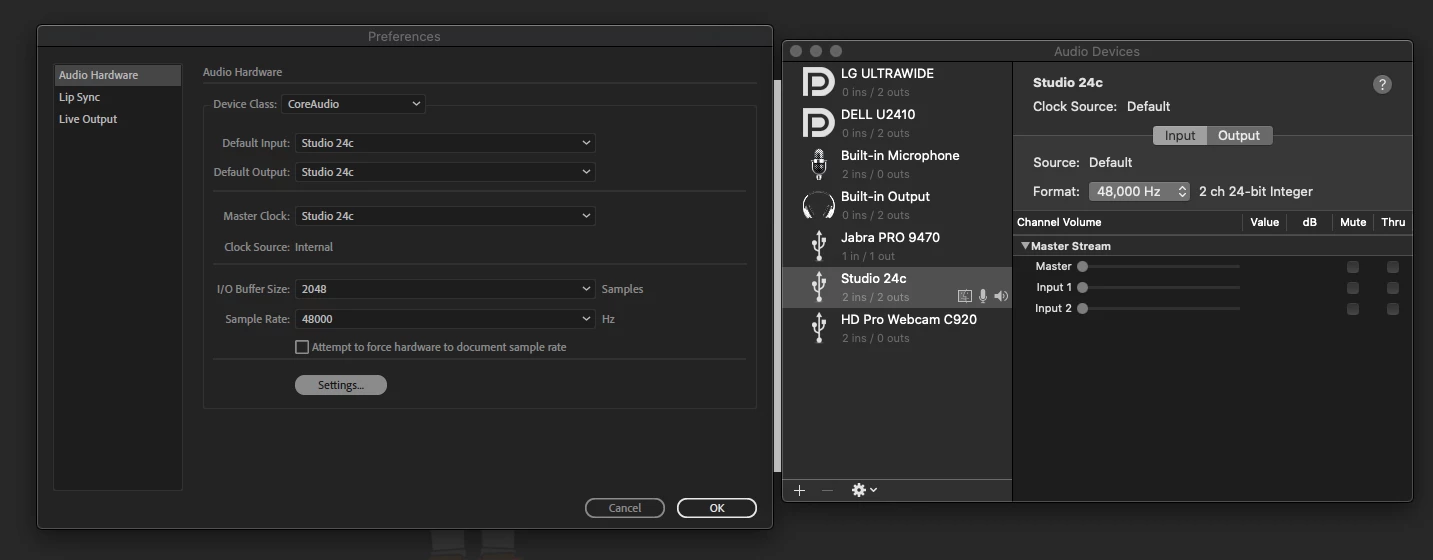 I have attached a screencap from Preferences>Audio Hardware>Settings. Under Settings, I cannot move the slider for Master under Master Stream, which I assume has something to do with the issue.