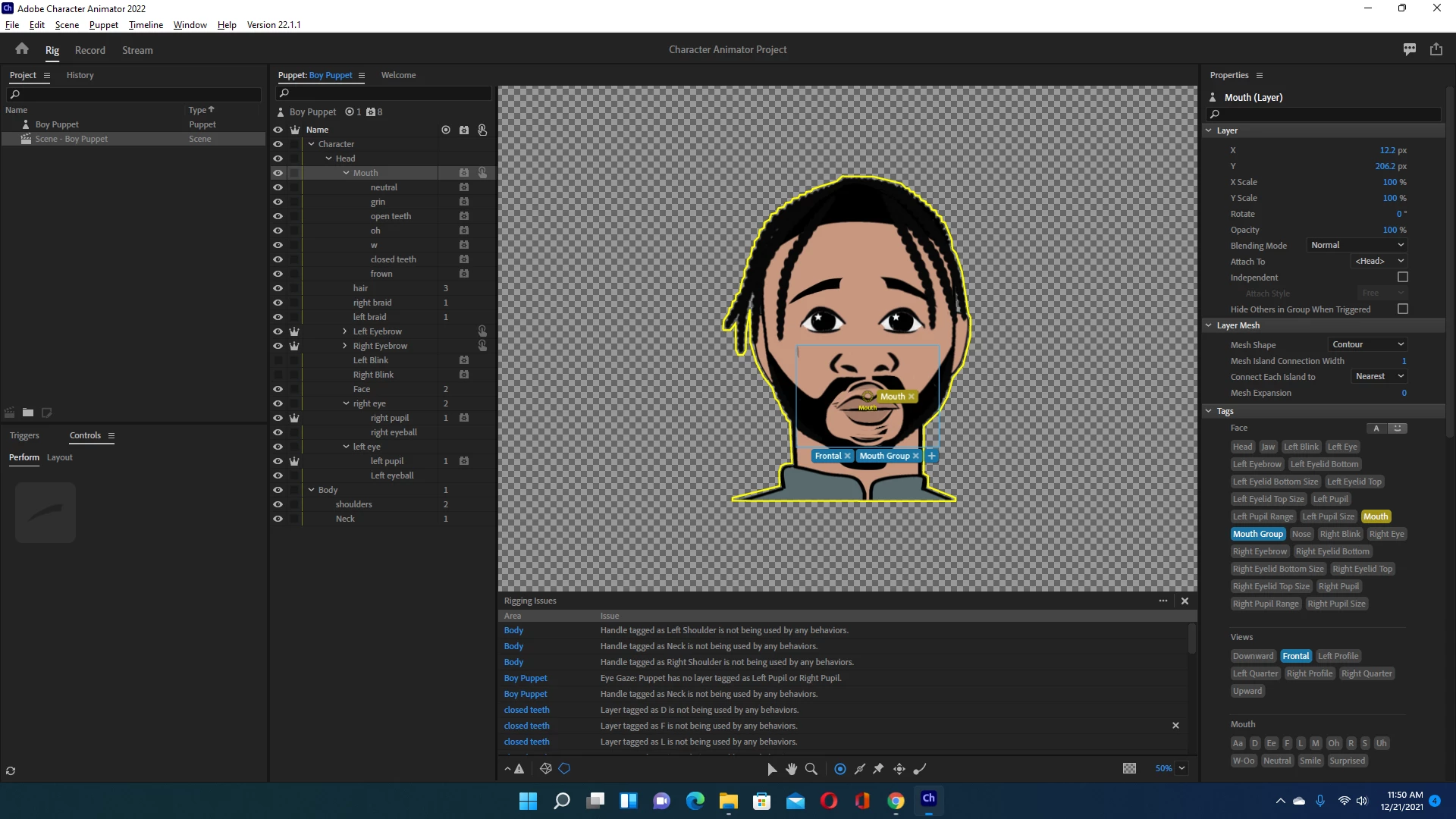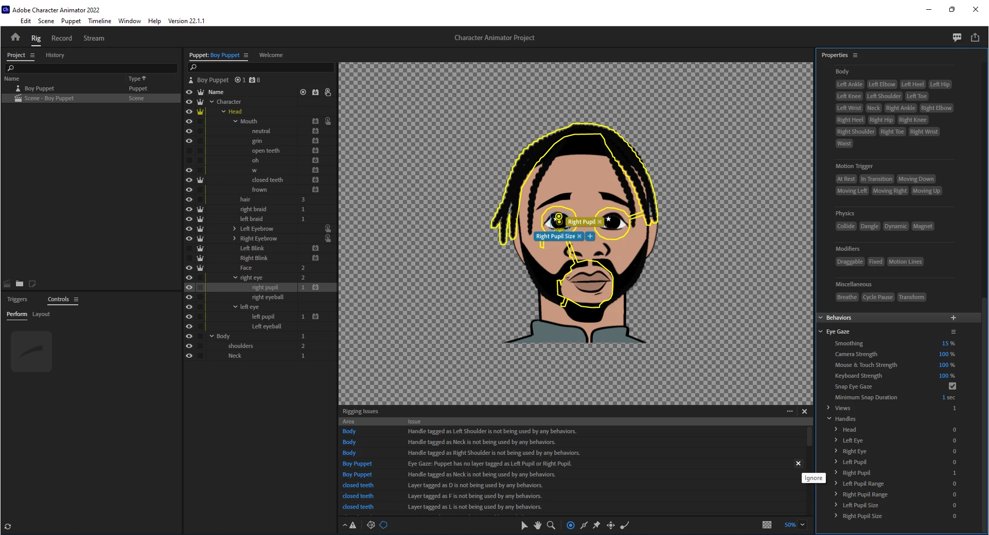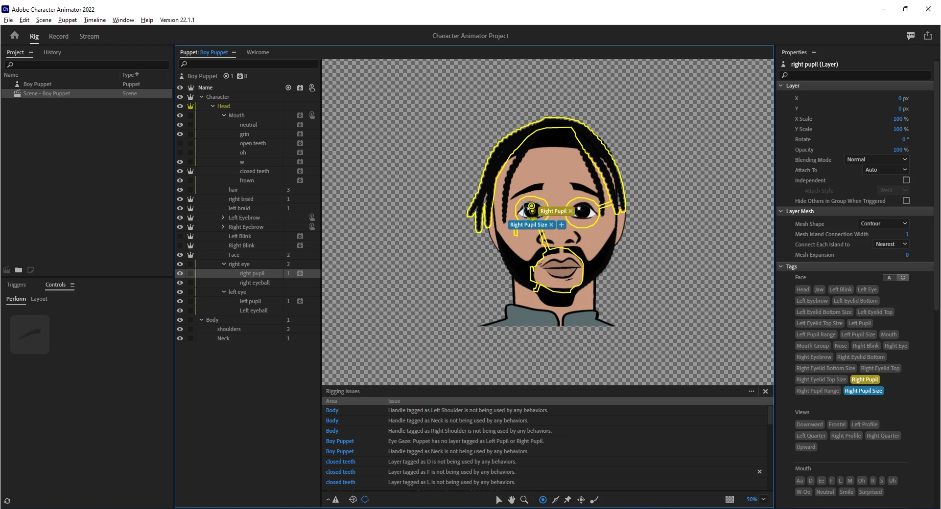 I hope someone will please help me! I have been fooling with this for days, watching all the YouTube tutorials and troubleshooting and getting nowhere. You can see in the screen shot attached that clearly I have layers tagged as the pupils, for example, and yet, in the error messages it says I do not. I have a list of errors a mile long. I am in tears. I am supposed to be doing this for a client. Please help!