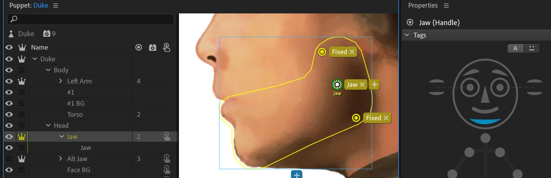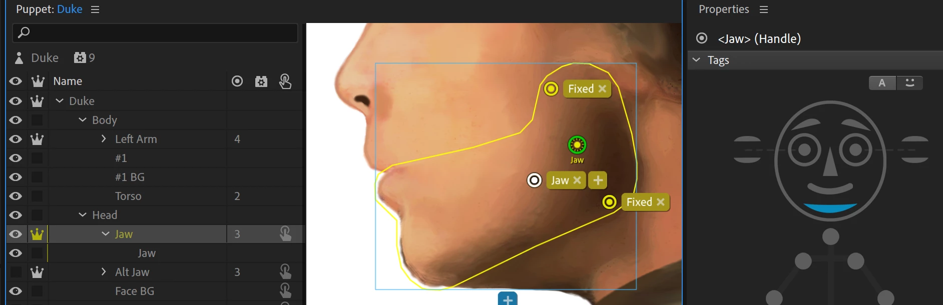 My character (in profile only) has a nutcracker jaw. Has it always been the case or is it a bug that I cannot insert fixed pins to one side of the jaw (art or group) to keep certain parts of the jaw from moving?