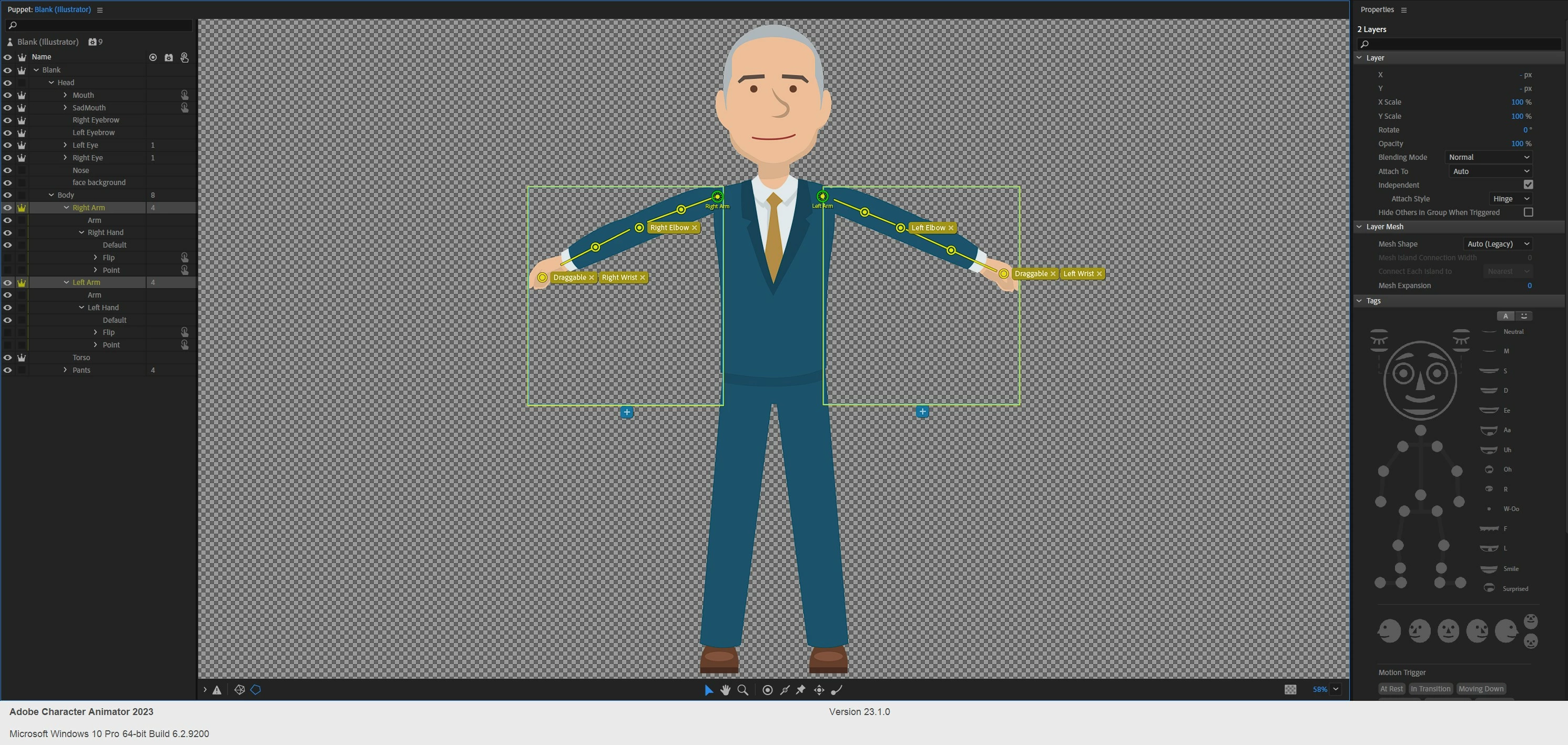 Need some help. Having an issue where one arm (right arm) is working as expected but left arm is stretching and distorting entire puppet. From what I can figure out both arms have the same settings and configurations.