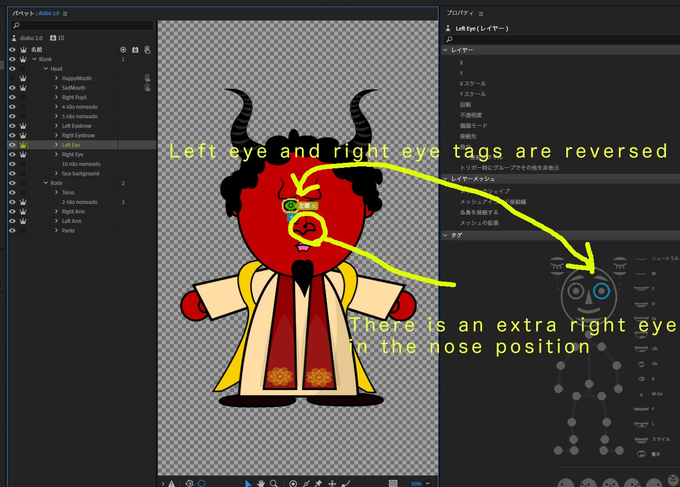 For some reason, only this puppet has this issue, the others work fine. The layer structure is correct as well (at least at first glance).
