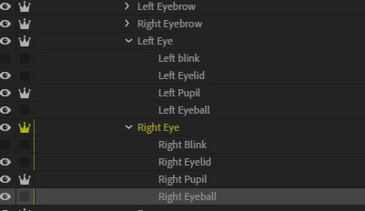 My layer hierarchy, tags, and crown layers for both eyes are exactly the same for both eyes. Both eyeballs are tagged as "Left/Right Pupil Range", both pupils tagged as "Left/Right Pupil" The eyeballs are bigger than the pupil layers as well.