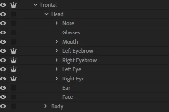 Unfortunately I can't share my project file or a screenshot of the puppet as this is client work, but here's my layer hierarchy.