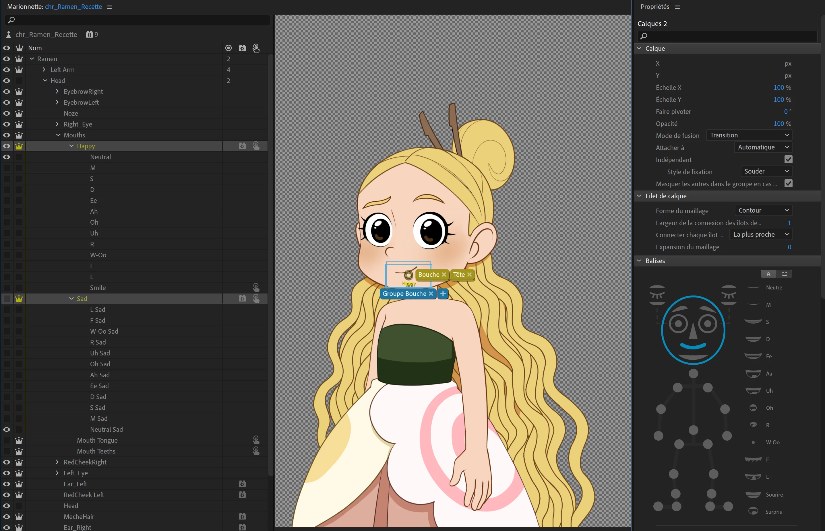 I have a problem with the lipsync, I have two sets of mouth, Happy and Sad ... there is only one of the two that can work at the same time, always the one who is above in the hierarchy, if I want to have the other set of mouths I must put it on top and there it works, this way I cannot go from Happy to Sad mouths by pressing a trigger. And if I want to make a lipsync compute from a sound, I have to put the mouth set that I want used in default even if it is not the main mouth set.