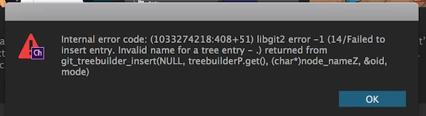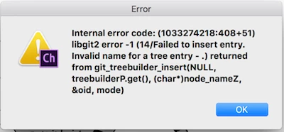 Internal error code: (1033274218:408+516) libgit2 error -1 (14/Failed to insert entry. Invalid name for a tree entry -.) returned from git_treebuilder_insert(NULL,treebuilderP.get(), (char*)node_nameZ,&oid, mode)