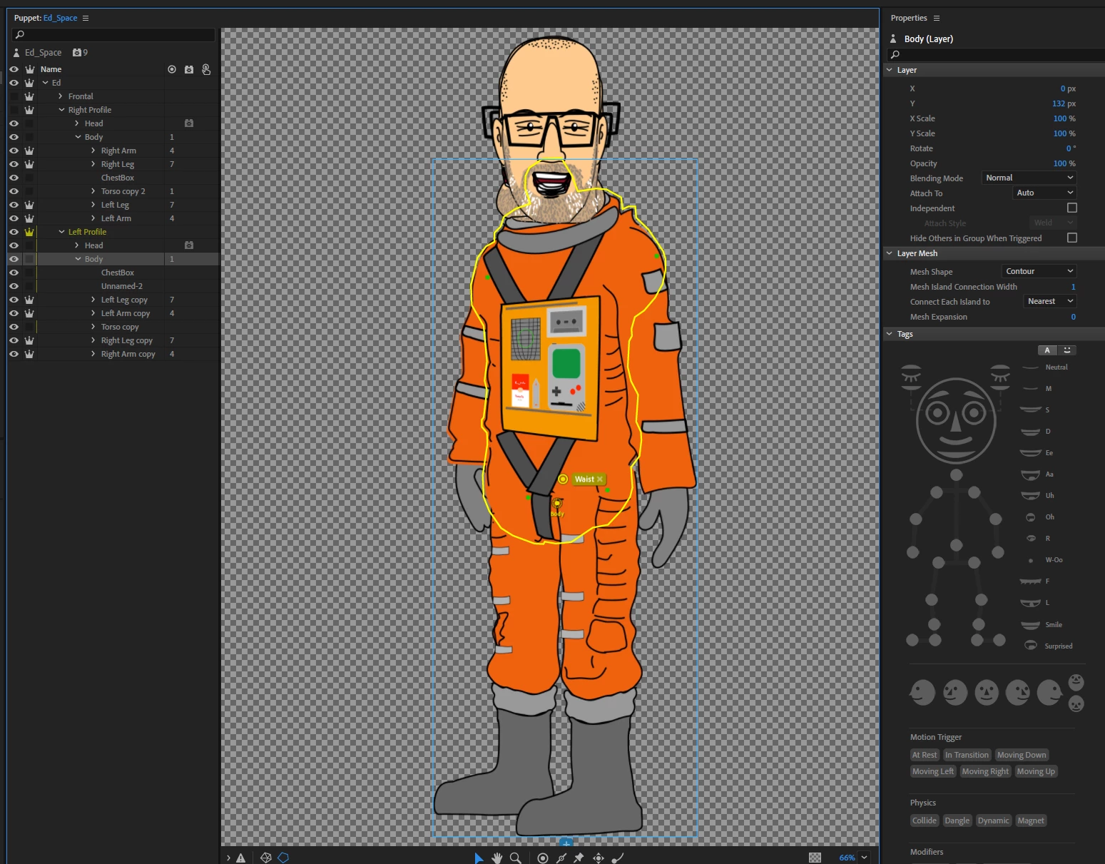 I'm making some characters with the walk/stand technique. it's not rocket science but there are a lot of layers. I have the 5 sideways head turns and the 3 bodies for left and right walking and standing. It all works ALMOST perfect I followed the 'walker' puppet pretty close at first to make sure I got the rigging right. So now it looks great but every time I hit the walk direction the legs pop out to an arbitrary place to hinge from, I don't understand why it's so inconsisent and whats determining the start point anymore. I'll post a video and still of it to see what I mean. It looks fine at first but you'll see that at random points the front leg will pop out to way in front of the puppet. I've moved the hips, the belly point, the neck, the entire legs and arms, I've trimmed the puppet over and over to be neat and in line, nothing seems to get me just a smooth walk cycle that's the same looking every time. Any ideas? Does the arm placement and pivot point make a difference? Maybe my feet tags need to move? length of bones help? I'm stuck.