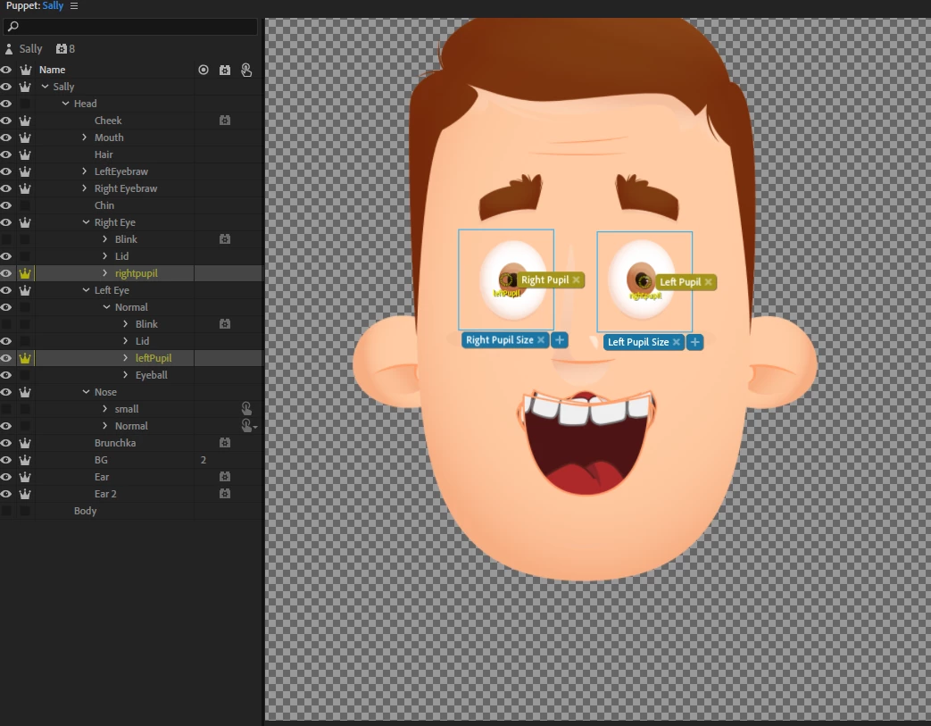 I can't figure out a few things. First, the pupils don't move. They are tagged properly ( I think) and I even have some triggers on them. Neither of the pupil variations moves.