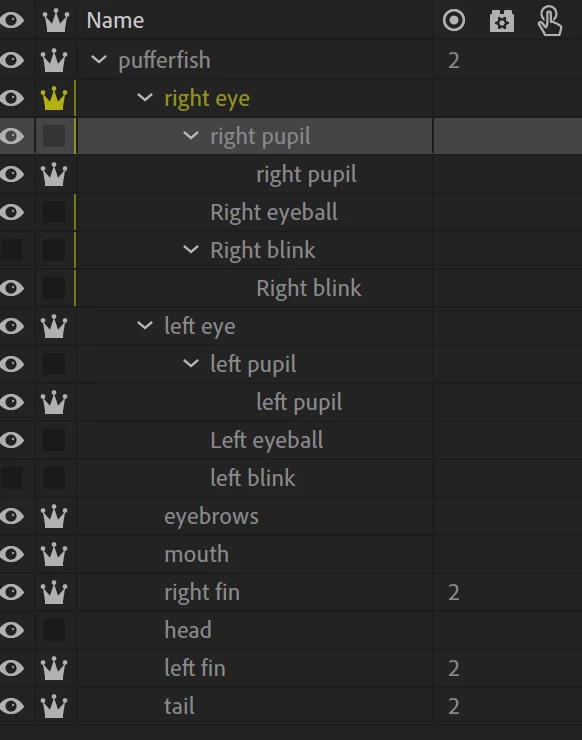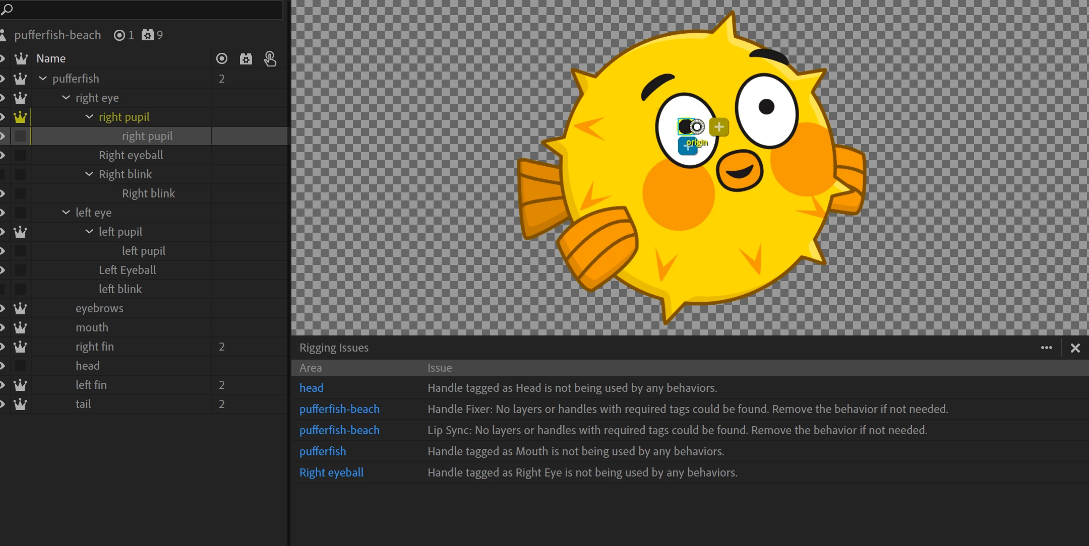 Hard to tell without having the art to examine, but my guess is that with a "right pupil" layer inside a "right pupil" group, both are auto-tagged Right Pupil. In that case the group will be the one that's controlled by Face (and the Rigging Issues panel should warn you that the layer one isn't matched to any behaviors). Since you have the layer crowned it will be on its own mesh. Still, that should move with its parent group, so I wouldn't expect it to be stuck. But try crowning the group instead of the layer, or making sure you have only one layer/group named "right pupil" (and same for left).