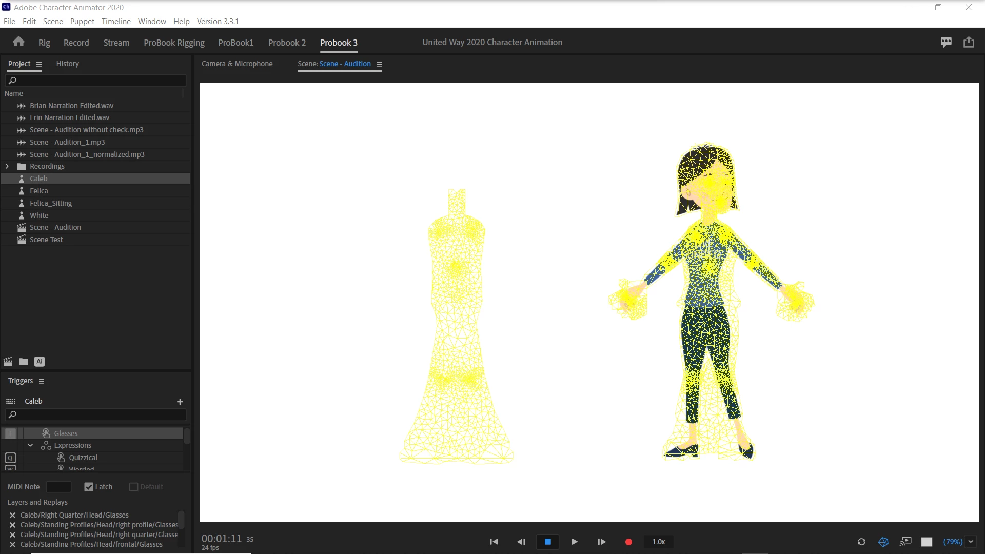 I am a newbie. This is my first animation. I am trying to get a puppet named Caleb to walk. When I added the walk behavior, assuming his handles were all set correctly, he did nothing. I have him in a scene to which I have lip synced a voice track and added several motions and triggered actions. While searching for cues to the walking problem (using his Right Quarter) I changed his mesh from "auto" to "contour" and he disappeared from the scene. Changing back to auto did not bring him back. The scene still plays with his counterpart, Felicia, still visible and both Caleb and Felicia narration can be heard. The timeline shows both character tracks. When I click the “mesh” button in the timeline Caleb’s mesh shows up, just not Caleb.