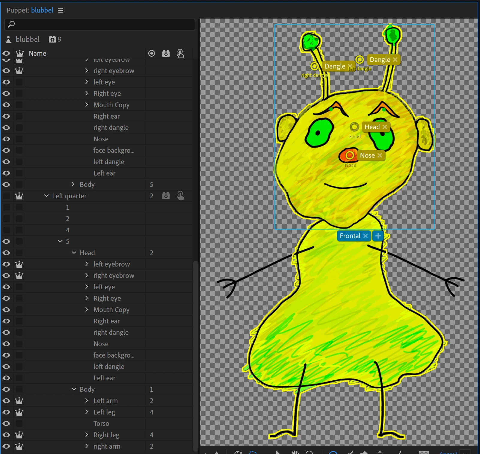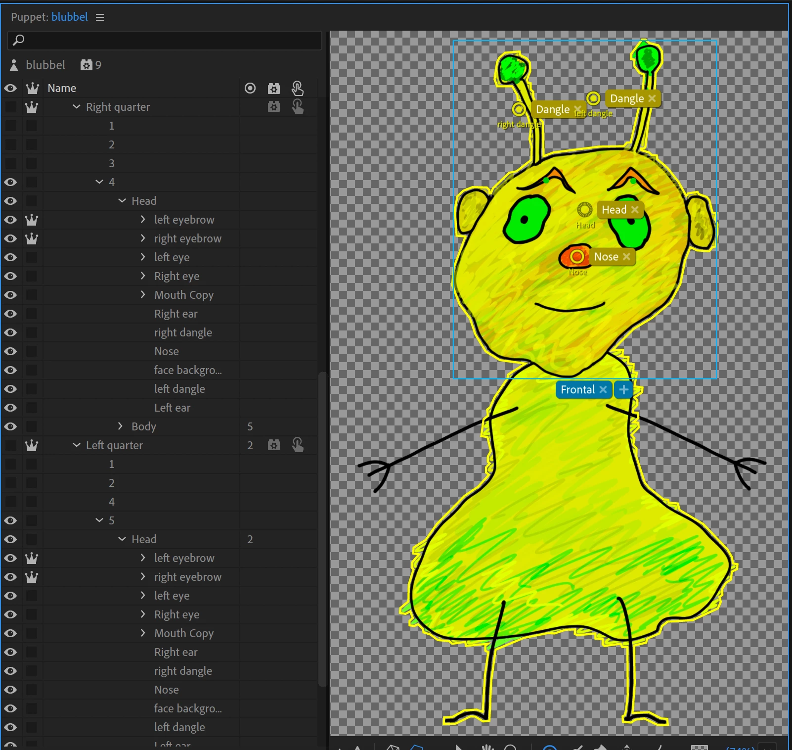 Hi folks, I had a nice walk to the left all going on, puppet turned - with some in between animation - but then when I tagged the other side it's all gone wrong and I can't figure it out. When I turn to the right now I have just a head and when I turn to the left I have nothing. Any help appreciated, this is driving me crazy!