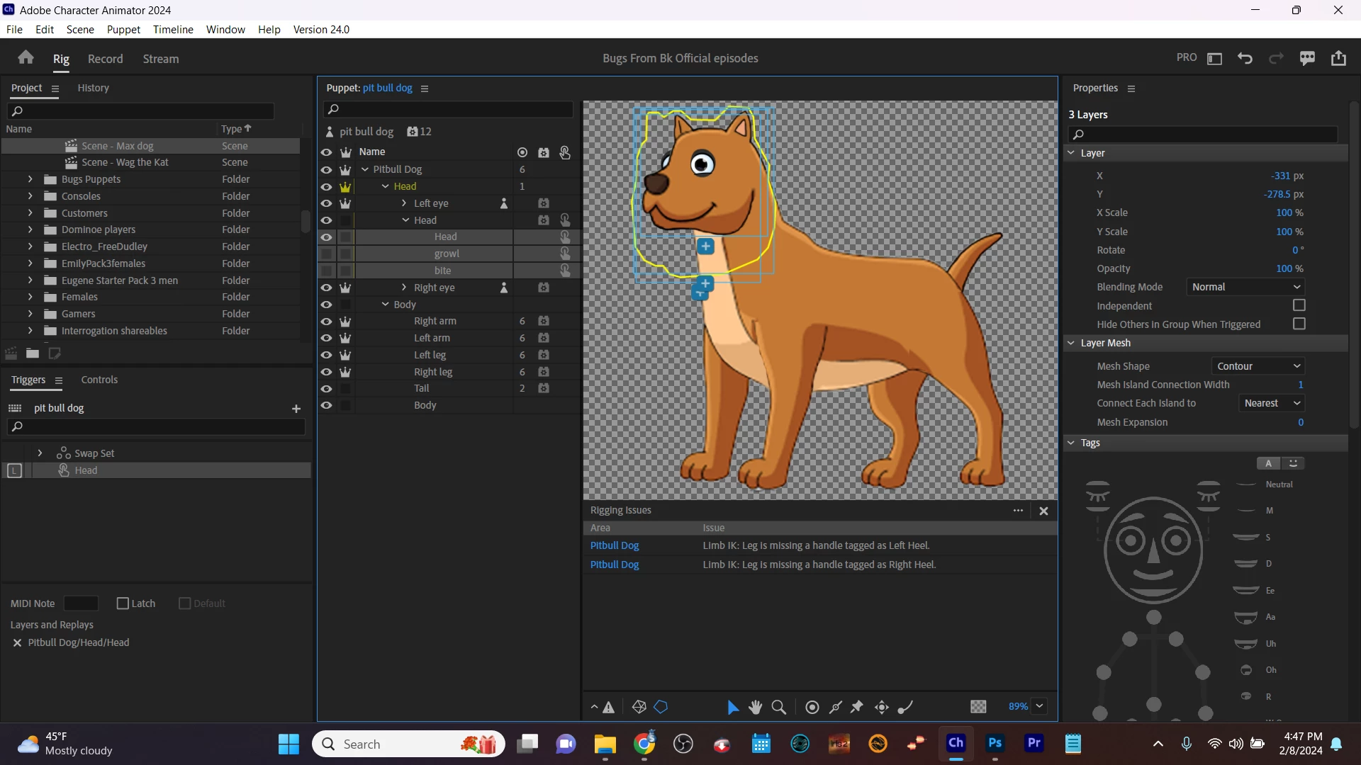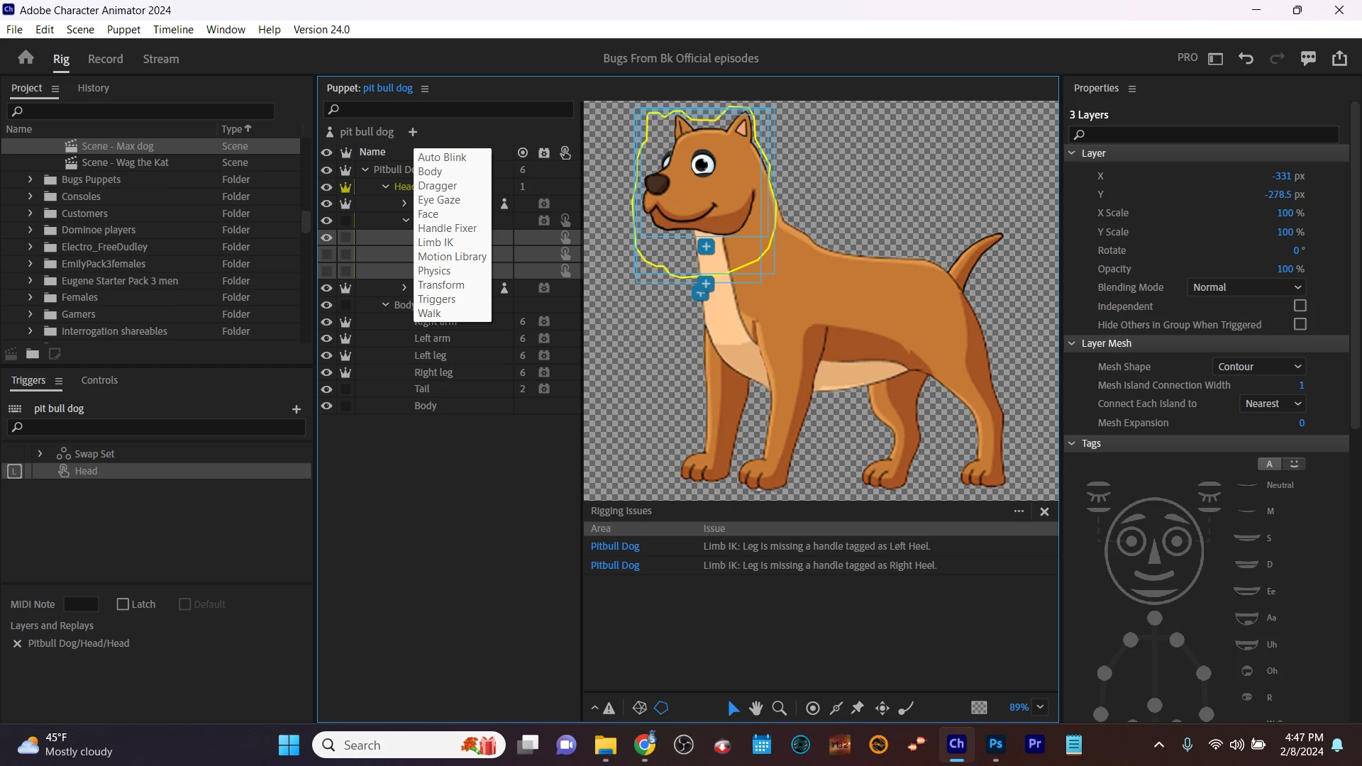Thank you for replying i actually figured out why it was doing that but I have a new problem, bare with me I am actually learning Thank You very much. My new problem is I am trying to rig a dog that I put into seperate layers. I tried to rig all the dog's legs as leg tags i dont know if i was suppose to do that. I need for the dog to walk and I added cycle layers for a bite  and growl which you can see in the Head folder. I got the cycle layers to work but im not understanding how to have the default face showing before i hit the trigger. I am also using shareable eyes for the default face which is why you're not going to see eyes on the default face in the PSD file i attached. I need for the shareable eyes to disappear when i trigger the cycle layer for growl and bite because growl and bite has eyes drawn into the illustration already. I hope i explained myself properly for you to understand. Can you help me i attached the PSD file plus screenshots.