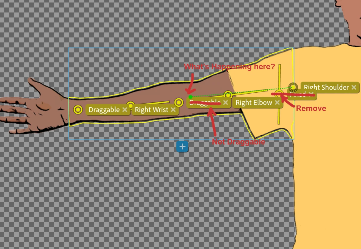 I am currently working on a puppet project. I have imported the puppet into CA and have tried to rig the limbs and others. I for some reason cannot figure out why the arms and hands are at a stand still even after adding handles for elbow, wrist and shoulder. I've also added them to be draggable. This is very frustrating considering I've troubleshot most of the problems I have encountered but I am somewhat stumped... any help/suggestions is greatly appreciated.