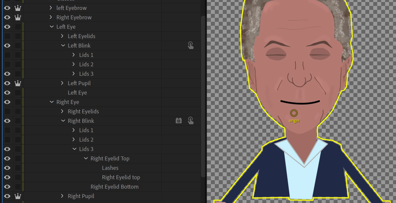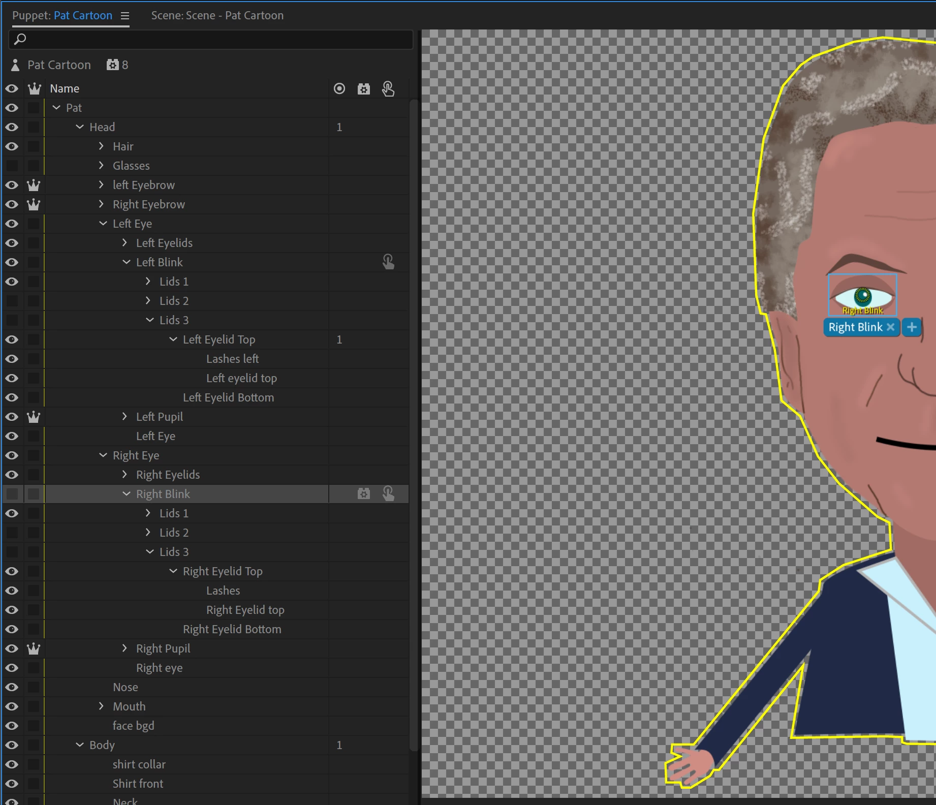 I've created a puppet with a blink cycle, like the demo character "Dave". The blink seems to work, but the eyebrows disappear during the blink. I'd dearly appreciate any debugging help.