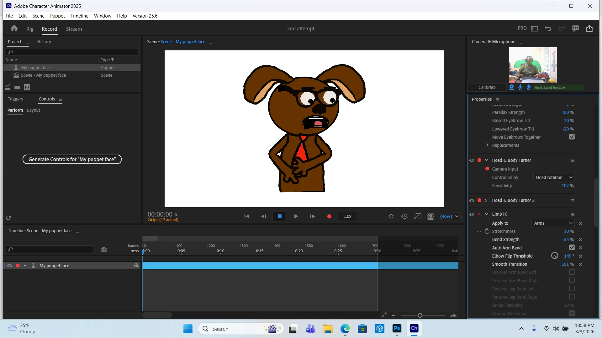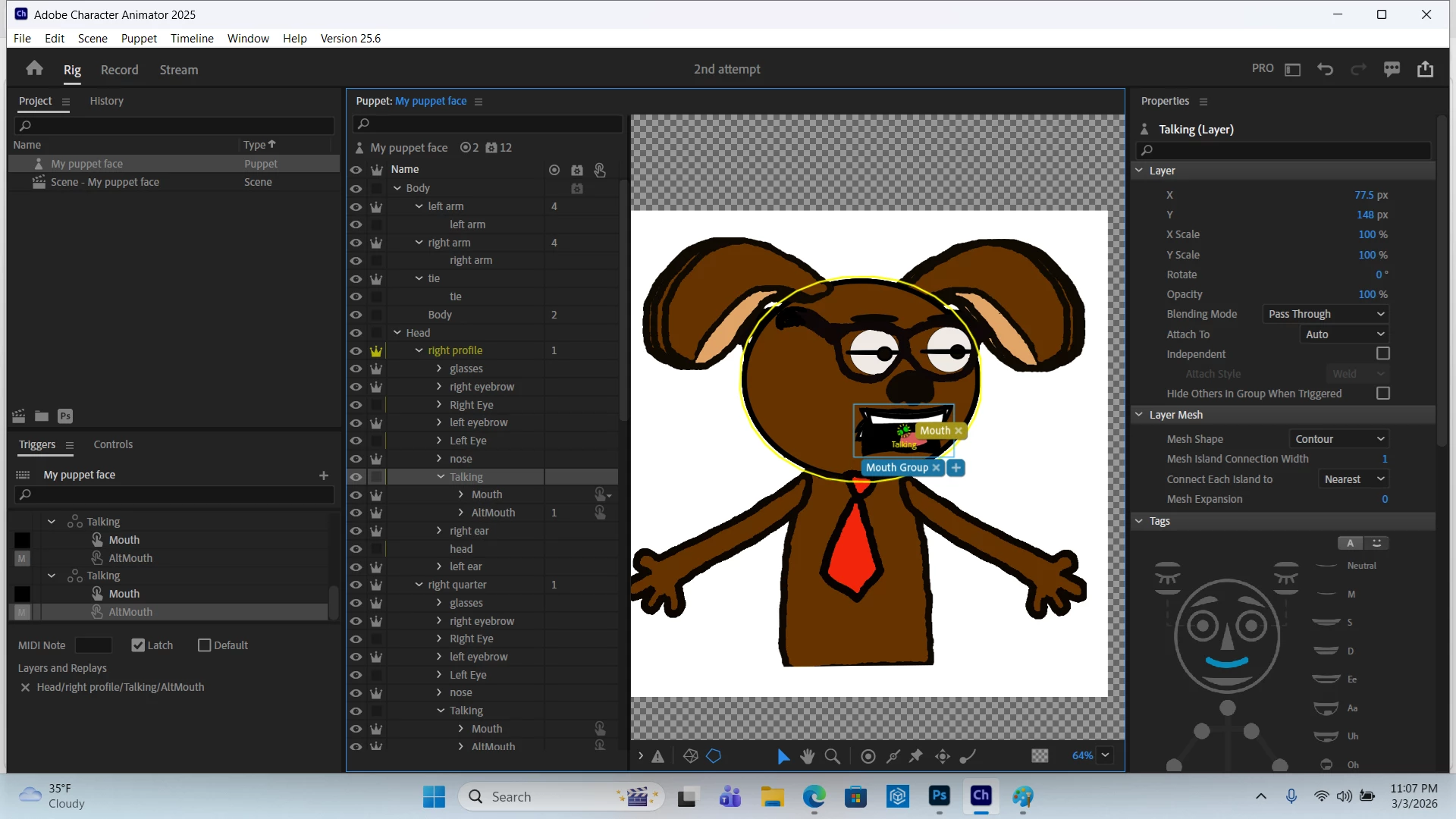 I tried my puppet to a new laptop for Character Animator. While all the layer settings, including the different layers for head turning, are correctly labeled in Photoshop, (see first picture) when I import to CA, it’s a complete mess in the Scene. (See second picture). I assume the solution is to re-rig everything but I’m not sure how to do it. I fixed the arms so far to be draggable and bend correctly. However I’m not sure how to fix the mouth and head movements. Can someone please walk me through how to get everything back to look like the third picture I’ve attached?