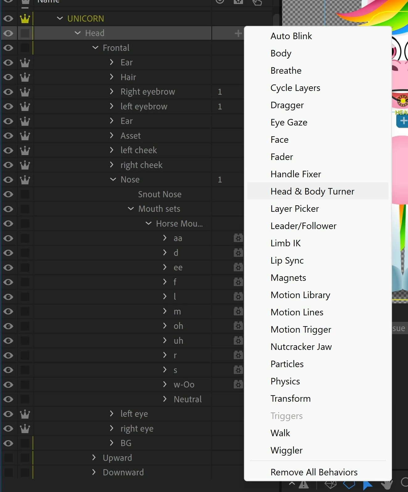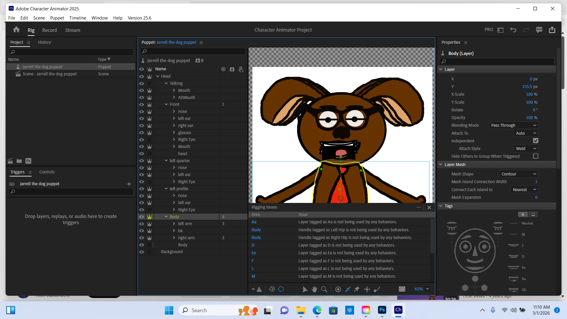 I tried my puppet to a new laptop for Character Animator. While all the layer settings, including the different layers for head turning, are correctly labeled in Photoshop, (see first picture) when I import to CA, it’s a complete mess in the Scene. (See second picture). I assume the solution is to re-rig everything but I’m not sure how to do it. I fixed the arms so far to be draggable and bend correctly. However I’m not sure how to fix the mouth and head movements. Can someone please walk me through how to get everything back to look like the third picture I’ve attached?