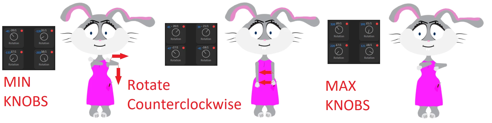 - Wrist swap required. I need to switch the wrist based on the elbow angle, so the big finger looks appropriate – not solved, but have an idea. We can send keypress to Character Animator as discussed in #1 + we can control the hand with midi slider. If we develop some small program that can read the value of my Midi slider, I can code the logic to send swap keypress based on the midi values.