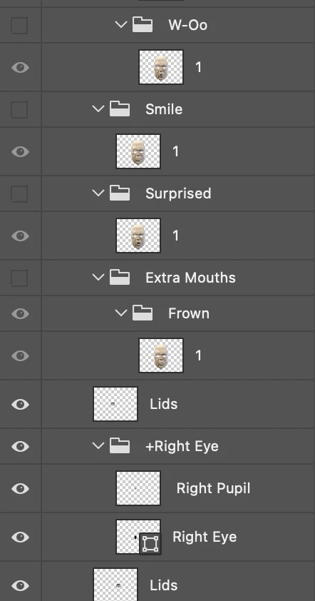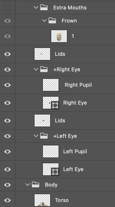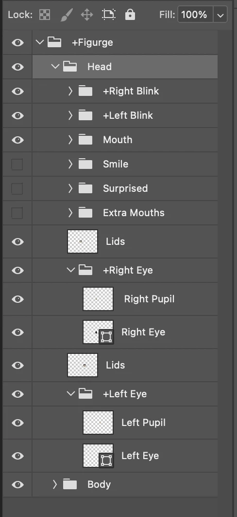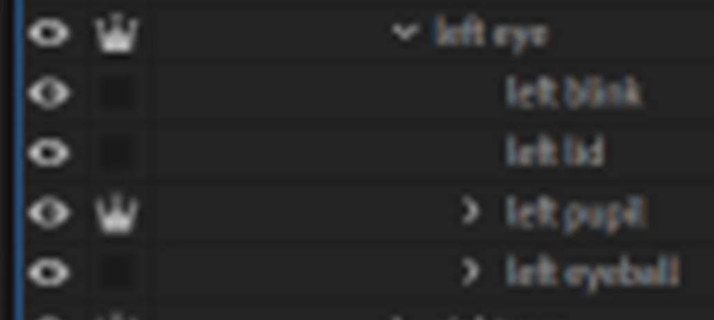 • As pointed out by someone else, blink layers should not be directly under Head. Blink works by hiding all siblings. So you normally put them in an eye group and hidden by default. Then when they are triggered, they hide everything else in the group. If you put it directly under Head, blinking will hide all the rest of the face artwork.