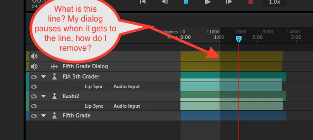 I have a scene with two puppets. After I uploaded the dialog for both puppets and synced the lip sync a strange line/highlight appeared in my timeline. Now when I run the scene back, it pauses when it gets to the line / highlighted portion. How do I remove that?