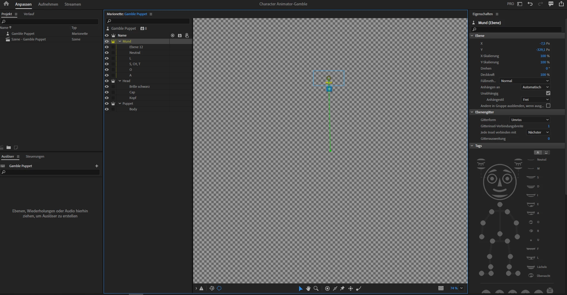 Jetzt das Problem, ich sehe die Figur nicht. Alles ist vorhanden, Ebenen, beschriftungen, verschiedene Münder. Alles wird auf der linken Seite angezeigt. Aber meine Figur, auf dem transparenten Hintergrund nicht.
