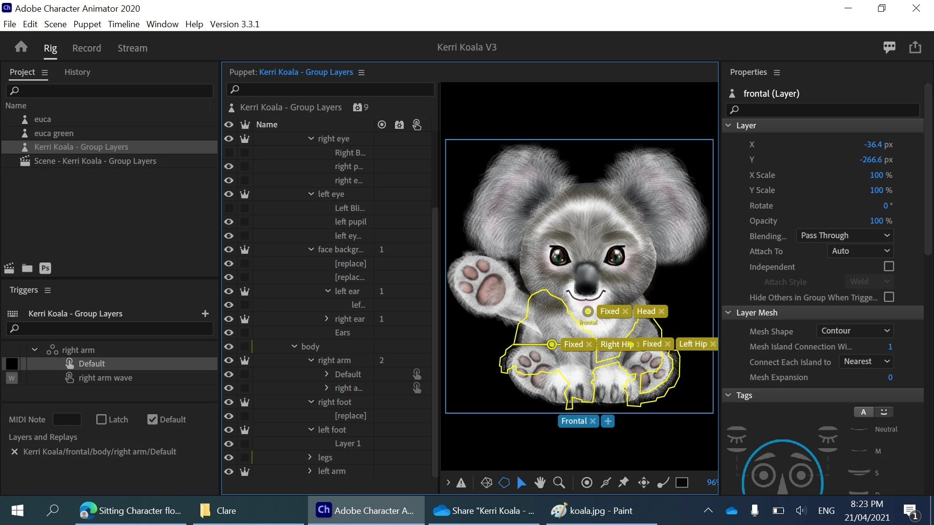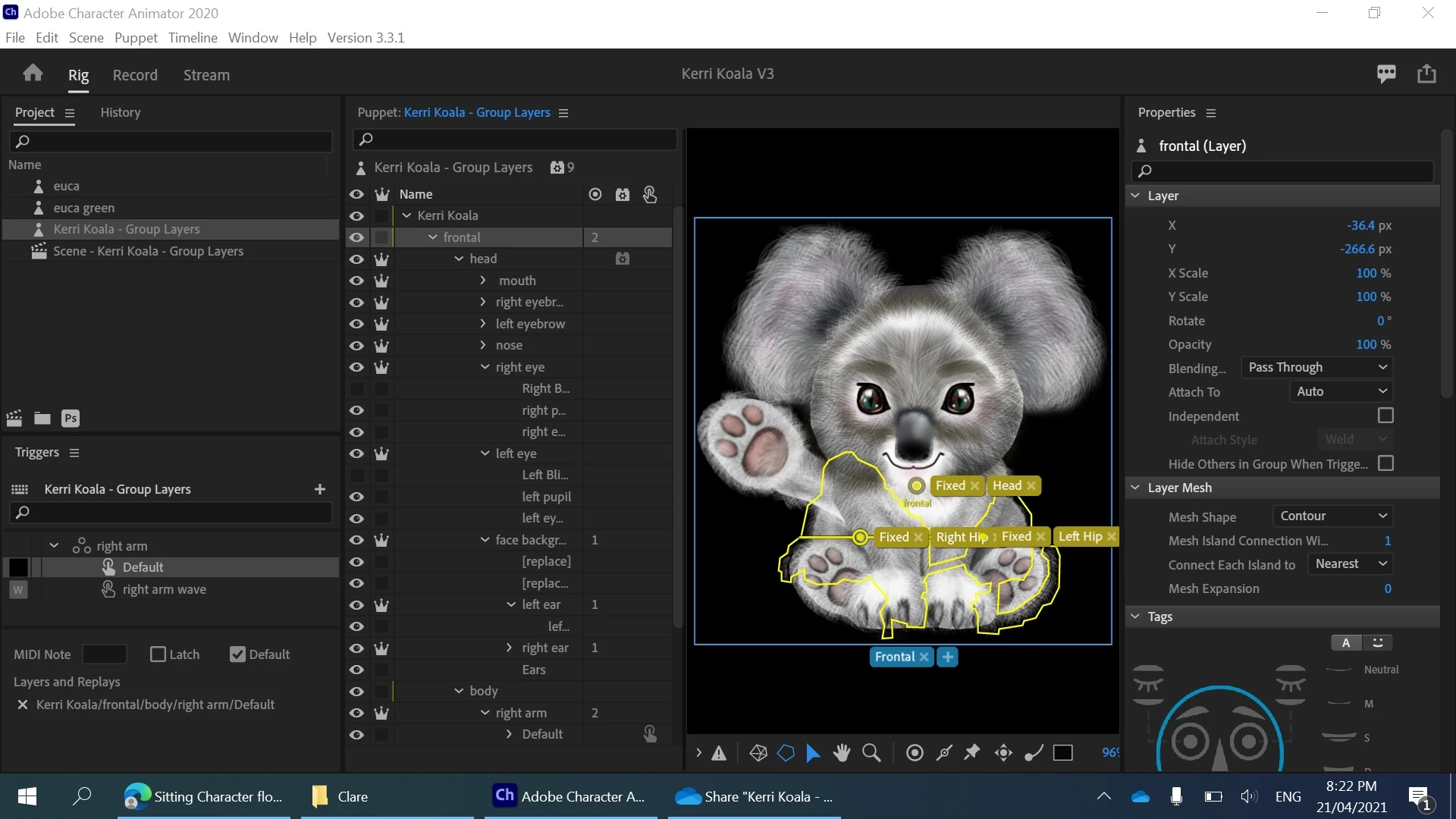 Hello, animation almost complete except for the floating issue. Character is sitting. Rigging to feet, head and arms, all working find. Followed online tutorials to create Frontal layer, I have various fixed handles in place. What else can I do? TIA