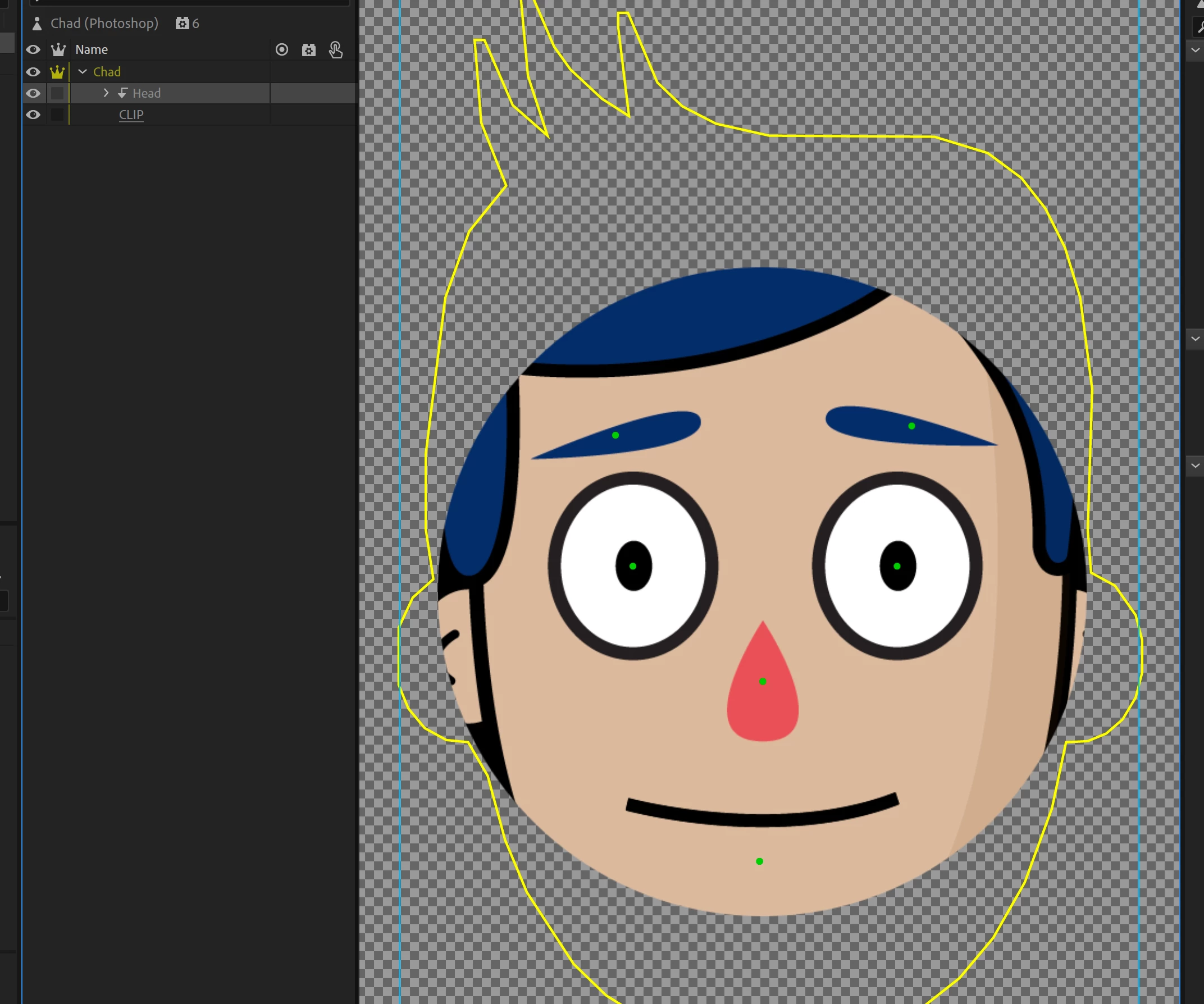 Perhaps there is a better way of doing this, but it is eluding me. I am making a character that needs to be mostly hidden behind a clipping mask. The face has many layers that are included for expressions, etc. However, Since I can't use a clipping mask on a group, I would have to put the mask on each layer inside the group. That is cumbersom to say the least. Simple solution is to make a smart object out of the group and clip the mask to that. However, it seems Character Animator doesn't show smart objects. It will import fine, but nothing is shown.