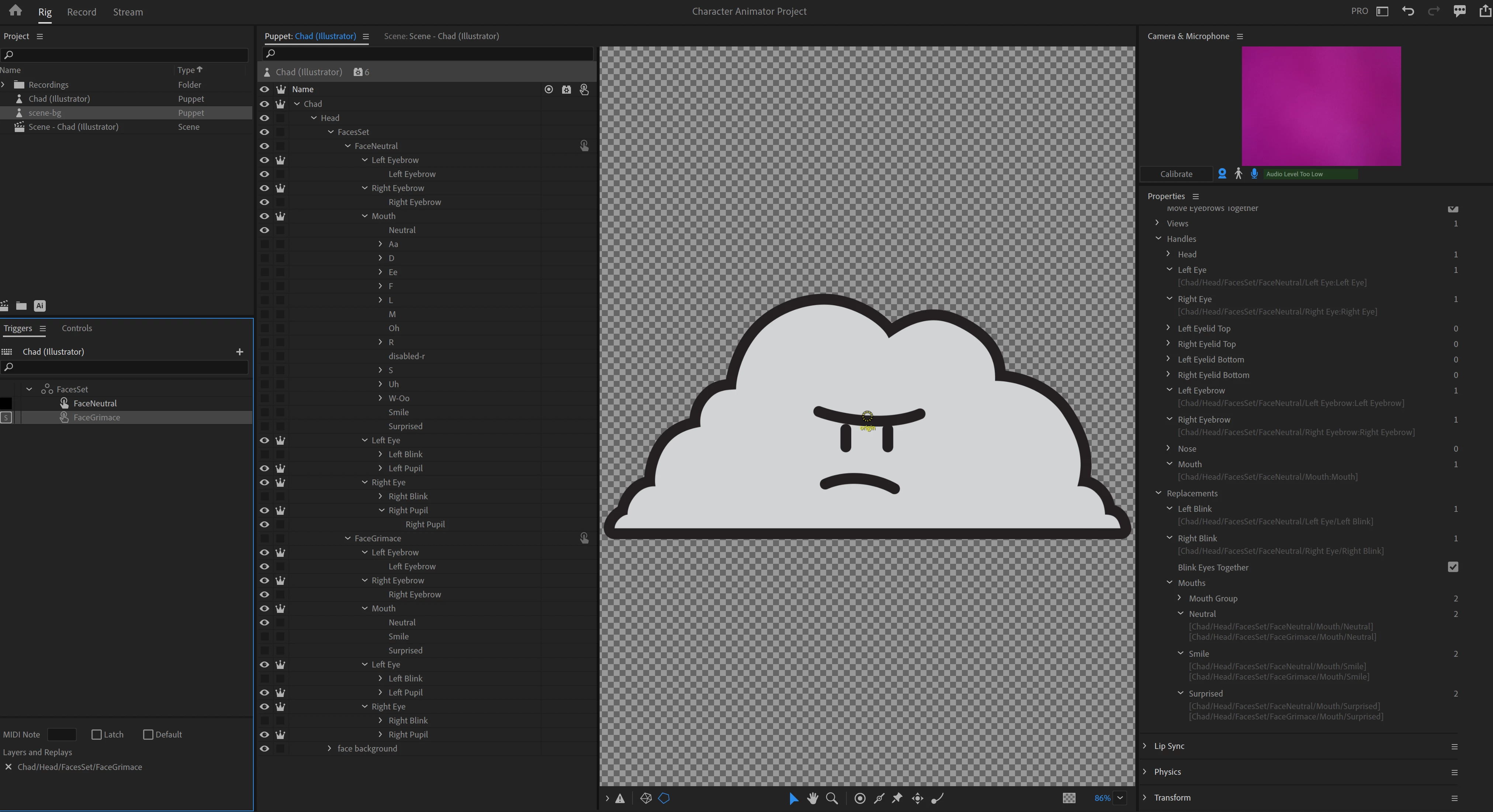 Just working on my first project. For basic use it's working great. But I wanted to add a swap set face—the character is by default grumpy, and I wanted a comical version where he's trying to smile. I have the swap set smile (grimace) working just fine—the Neutral mouth is a slightly frowny grimace, the Smile is barely upturned, and Surprised is just slightly wider and more upturned. This is fun, because I can trigger the swap with the "S" key and perform all those variations with the face tracking camera (rather than having to