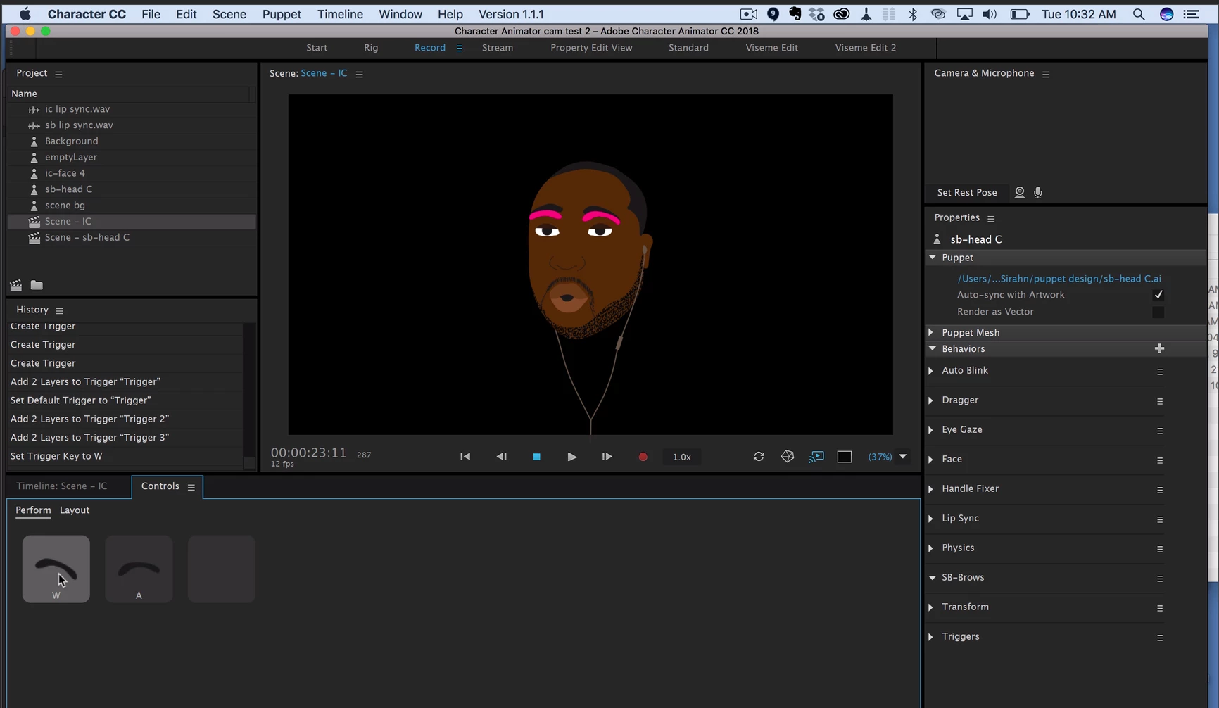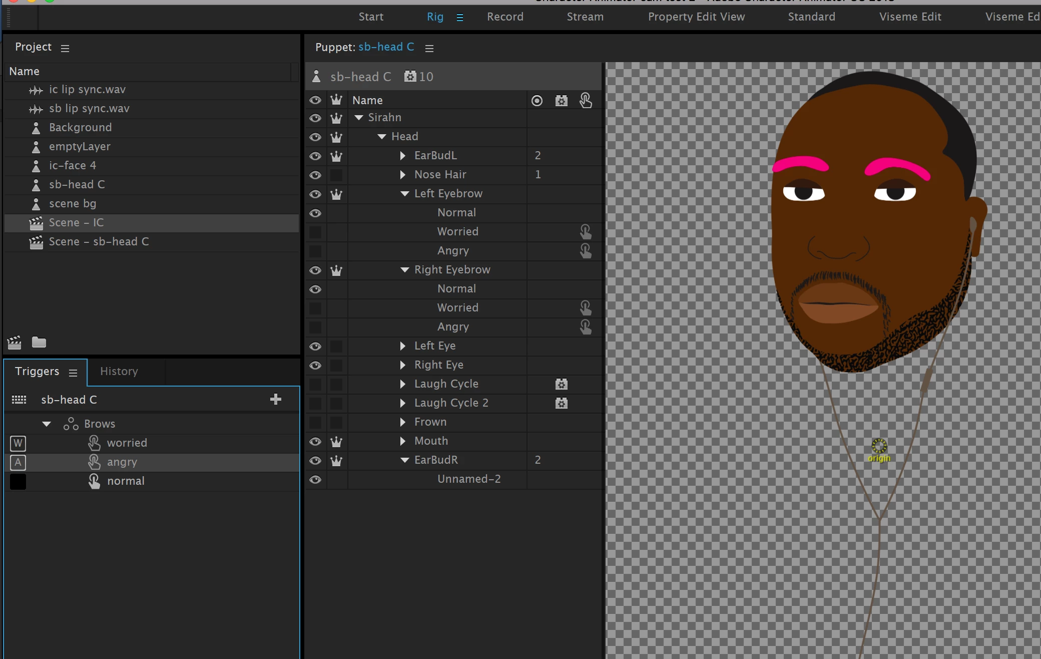 I have two eyebrow groups, each with a normal, worried, and angry state. I set the up the way it is shown in the Chloe example puppet.