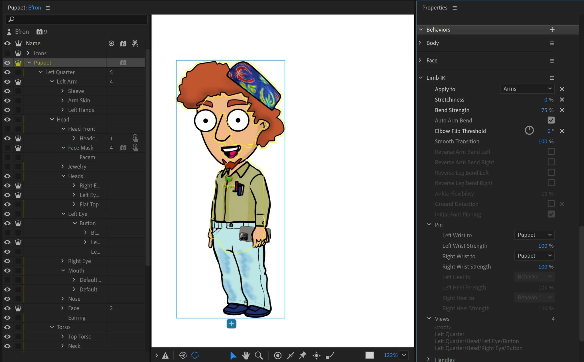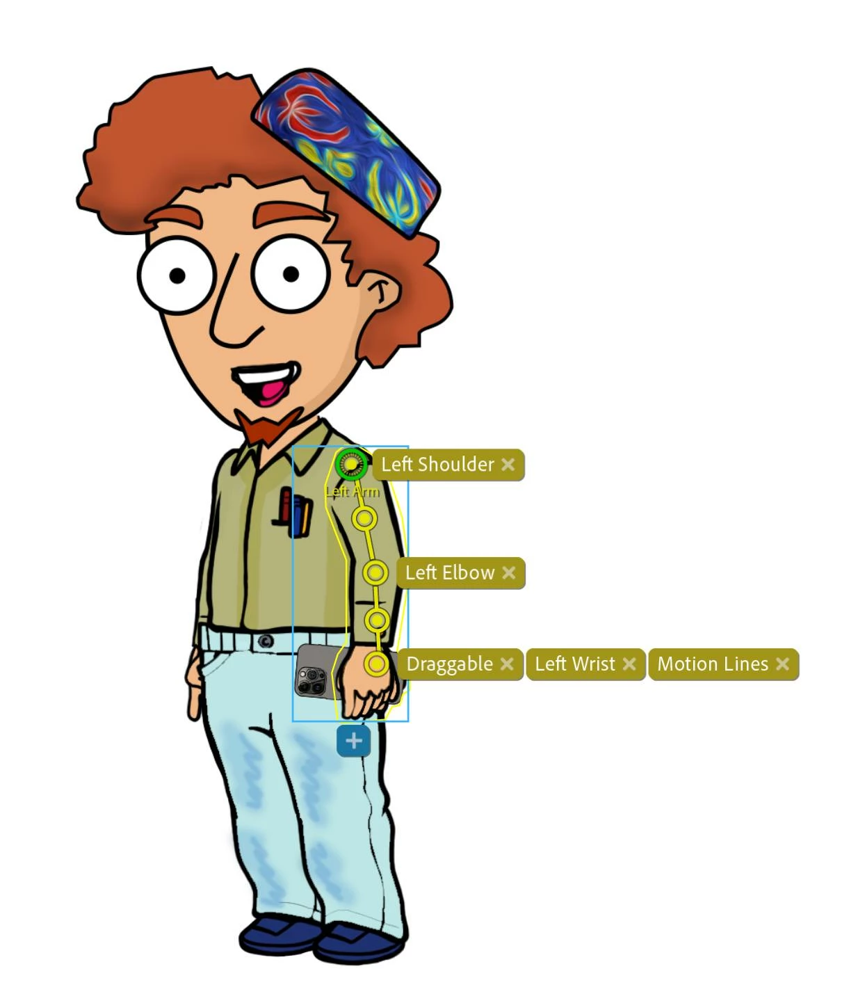I used one of the templates of the character generator in Character Animator, and changed it so that a new character was created for me. At first everything worked fine, but suddenly I can't control the joints in my character's left hand. I attached the pins to the arm, but still his arm doesn't flex. However in the right hand it still works.