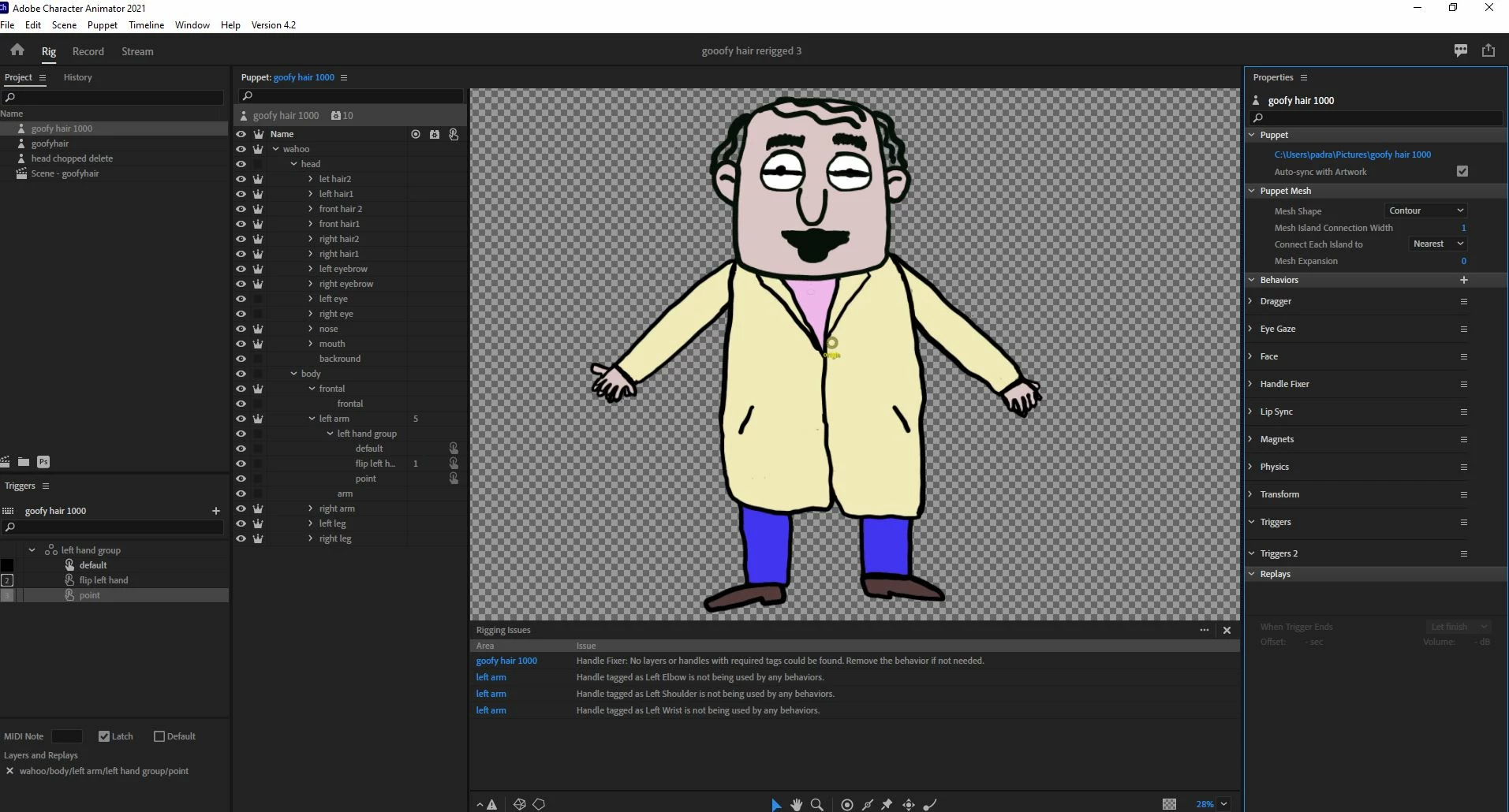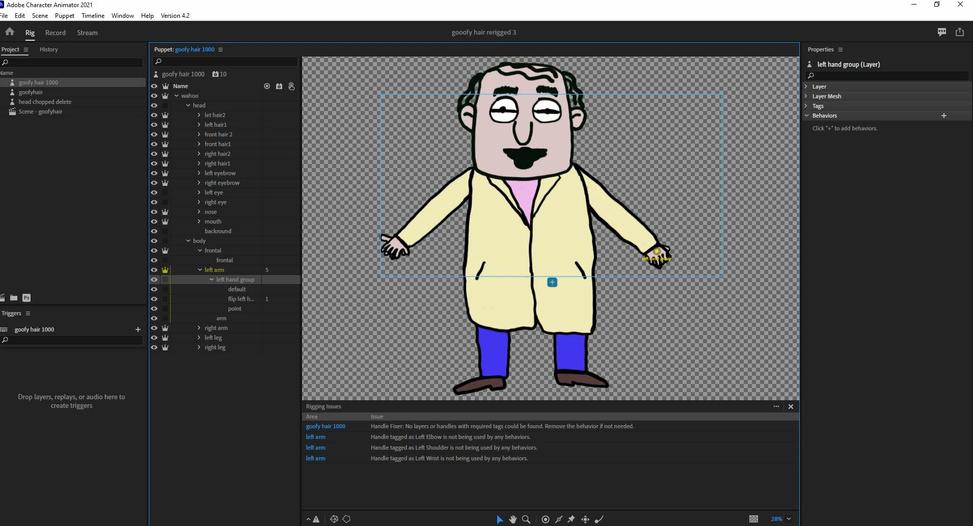Not sure exactly what the question is, but I notice the layers in the rigging hierarchy do not have triggers defined on them. You can add a trigger from the hierarchy for example. Triggers are displayed in the triggers panel (on the left) not in the properties panel (on the right). In this case, I would suggest creating a swapset on the hand layer about the three hand positions. This will create 3 triggers for the hand positions and create a swapset for you immediately as well (saves time). That way only one of the three will be displayed at any time. The swapset will also be visible in the triggers panel (not properties panel).