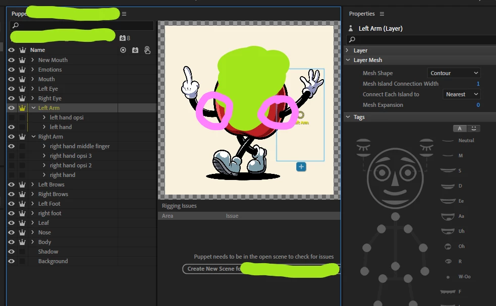 When I switch to Scene and drag the wrist, the entire arm comes off the shoulder instead of bending in between. I’ve tried adding mesh-warp pins at the mid-arm, adjusting mesh shape (Rectangle vs. Contour vs. Legacy), expanding the mesh, and toggling behaviors on/off, but nothing keeps the shoulder anchored reliably.