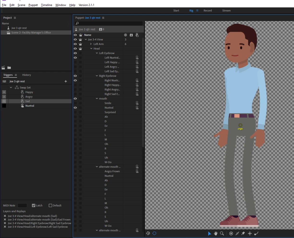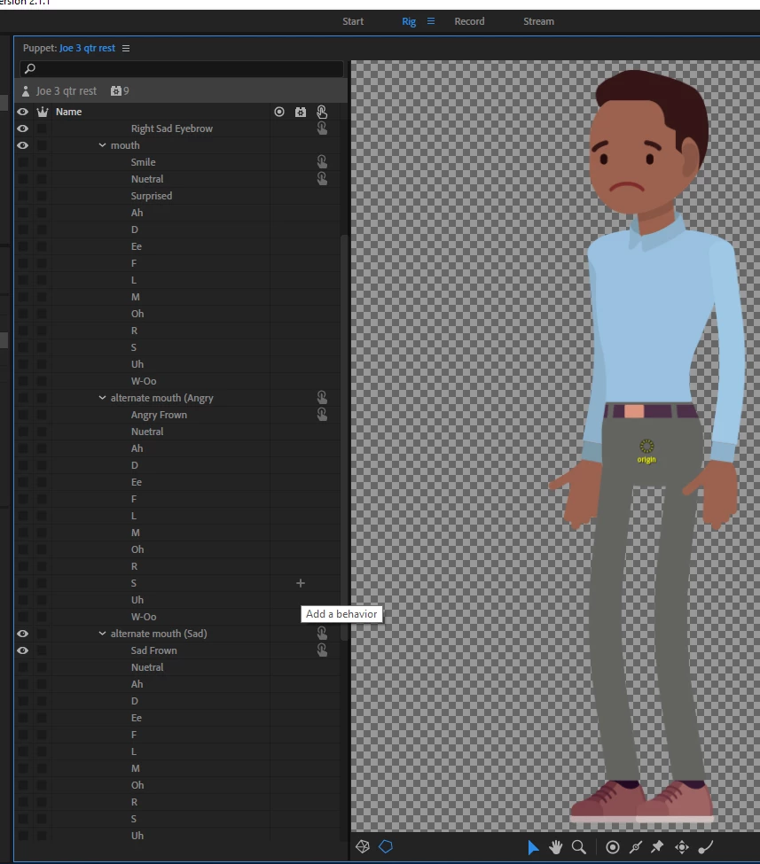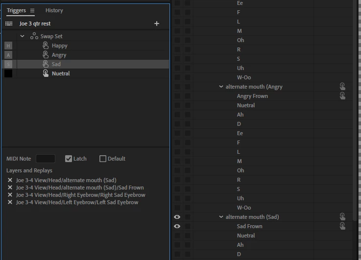 I'm running Character Animator Version 2.1.1 in Windows 10. I have a puppet that has two alternate mouth sets (Angry and Sad). My original mouth set has a default of Neutral. I want to be able to switch from Neutral to Happy (Smile), to Angry, to Sad. I also have four eyebrow sets, one for each mouth state.