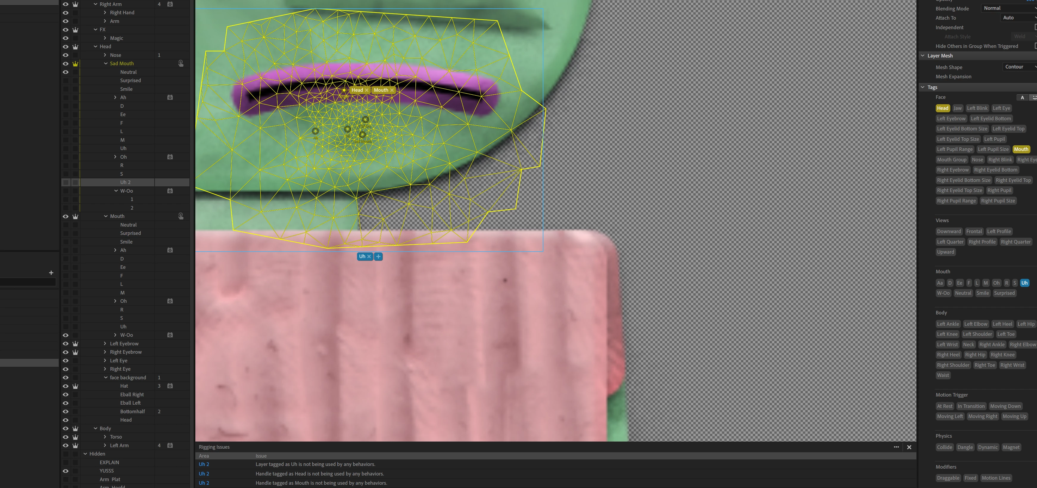 The problem is that all the viseme's are working except for the "Uh"sound. It's tagged exactly the same way as all the other sounds (which work). I've downloaded Bluster and Almasol puppets to check the diffrences but couldn't find any. The rigging isues is telling me "Layer tagged as Uh is not being used by any behaviors". Why does the Face Behavior know how to work with my other layers but not my Uh layer?