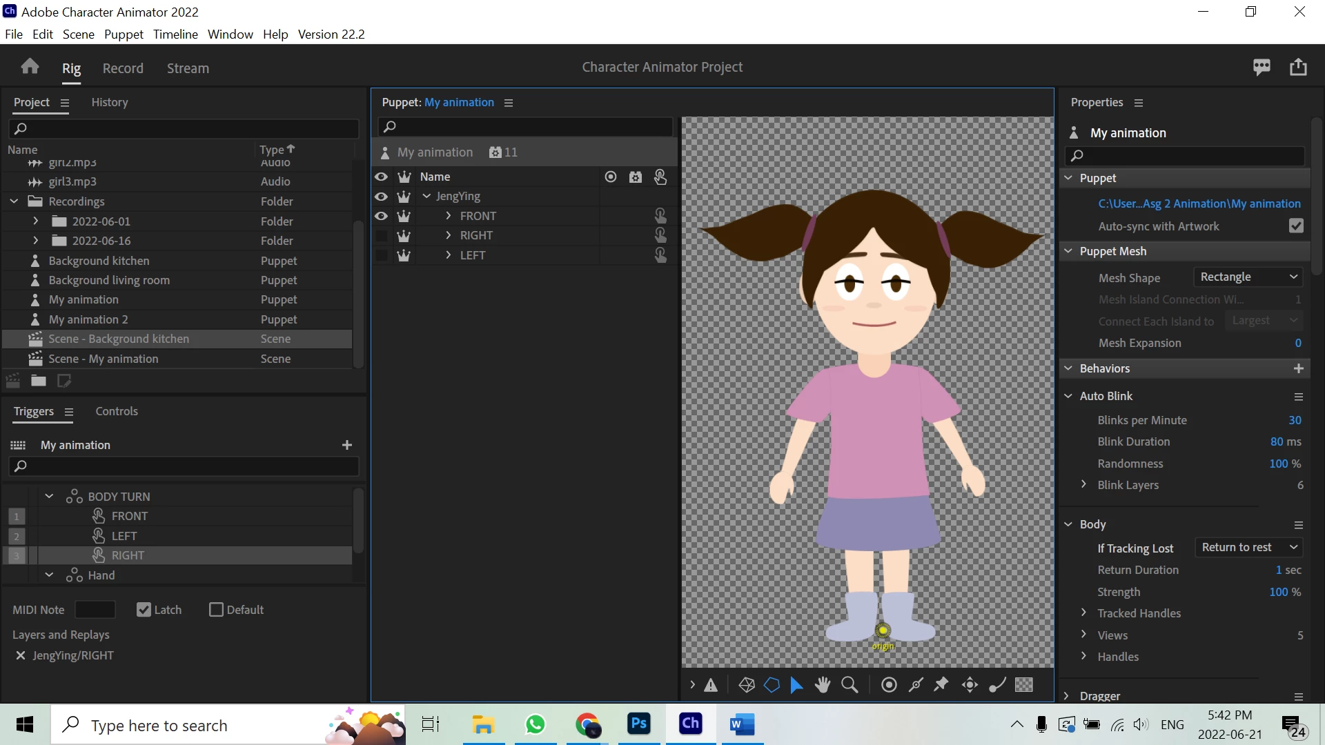 - When I record walking with left and right arrow keys, the puppet disappears when I let go of the key. Also, the puppet is only visible when I click the right key. It moves but won’t appear when I click the left key.