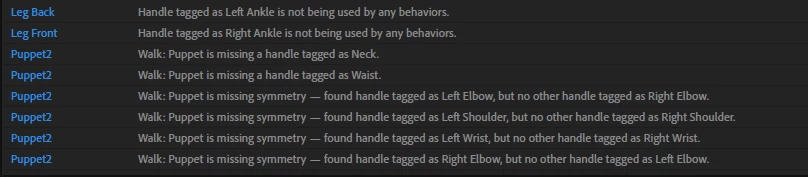 I'm very confused. I'm learning Character Animator and am very much an amateur, but I'm trying to get a walk behavior to work on my character. When I rig it up for head and body turner, everything works perfectly, but as soon as I add the walk behavior, it shows me all kinds of errors about missing symmetry. It says, "handle tagged as left elbow, but no other handle tagged as right elbow," which isn't the case. It also says I'm missing handles tagged as Neck and Waist, but that's not the case either. What am I doing wrong? Any help appreciated.
