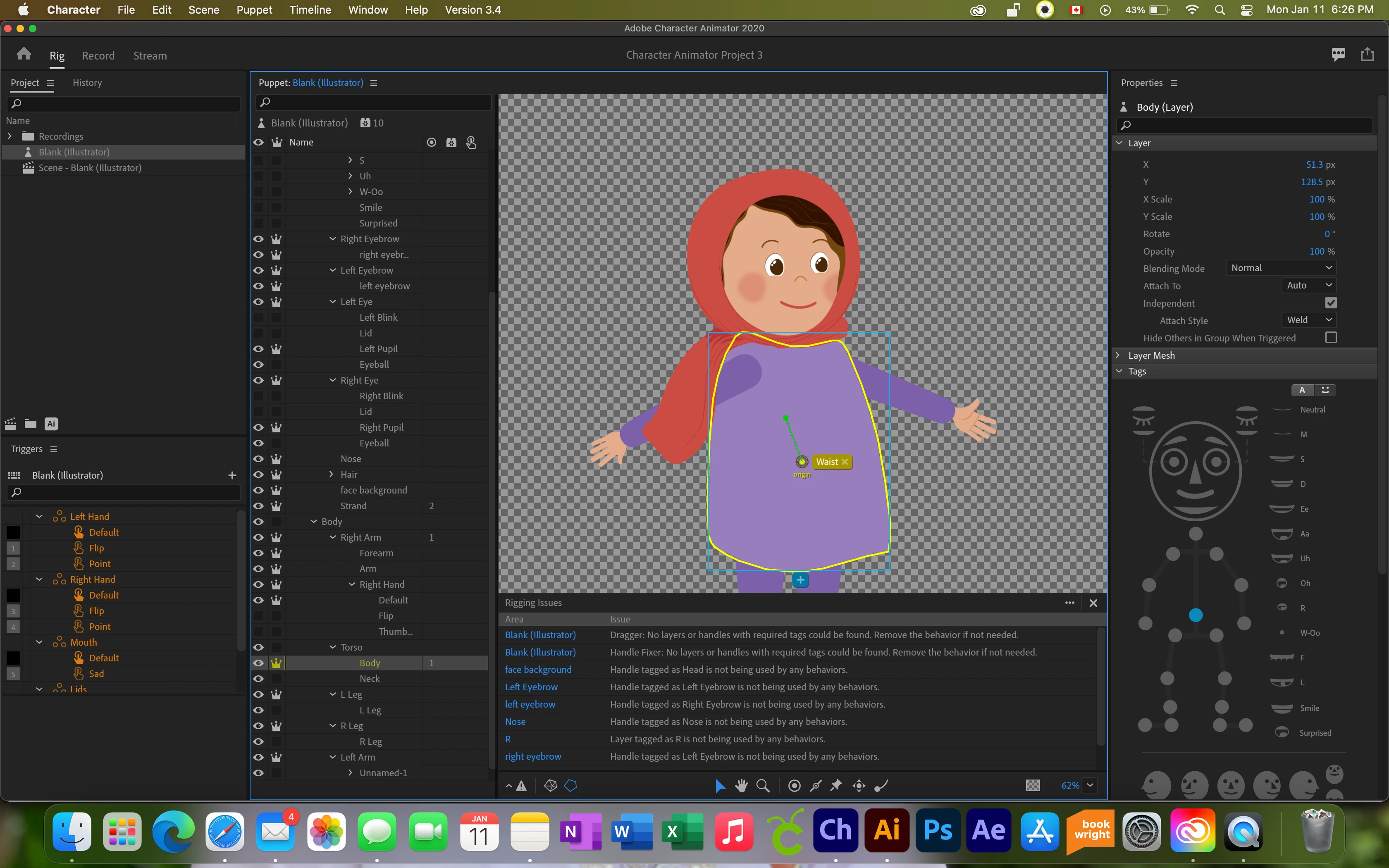 It is hard to be sure, but from screenshot it looks like you have too many independent layers. Each groups should have at least one child that is not independent. For your head, it would be the facebackground. Independent means "start a new mesh so this artwork does not warp with parent mesh". If all children are independent, there is nothing in the parent mesh to attach to (it's empty). So normally the main artwork for a layer is not marked independent.
