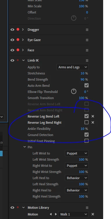 Hi I'm problems with my walk cycle, the arms and legs are bending the wrong way. I can change the elbow bend for the arms but I'm not sure what to do with the legs. I've also tried moving the knee but it doesn't make a difference.
