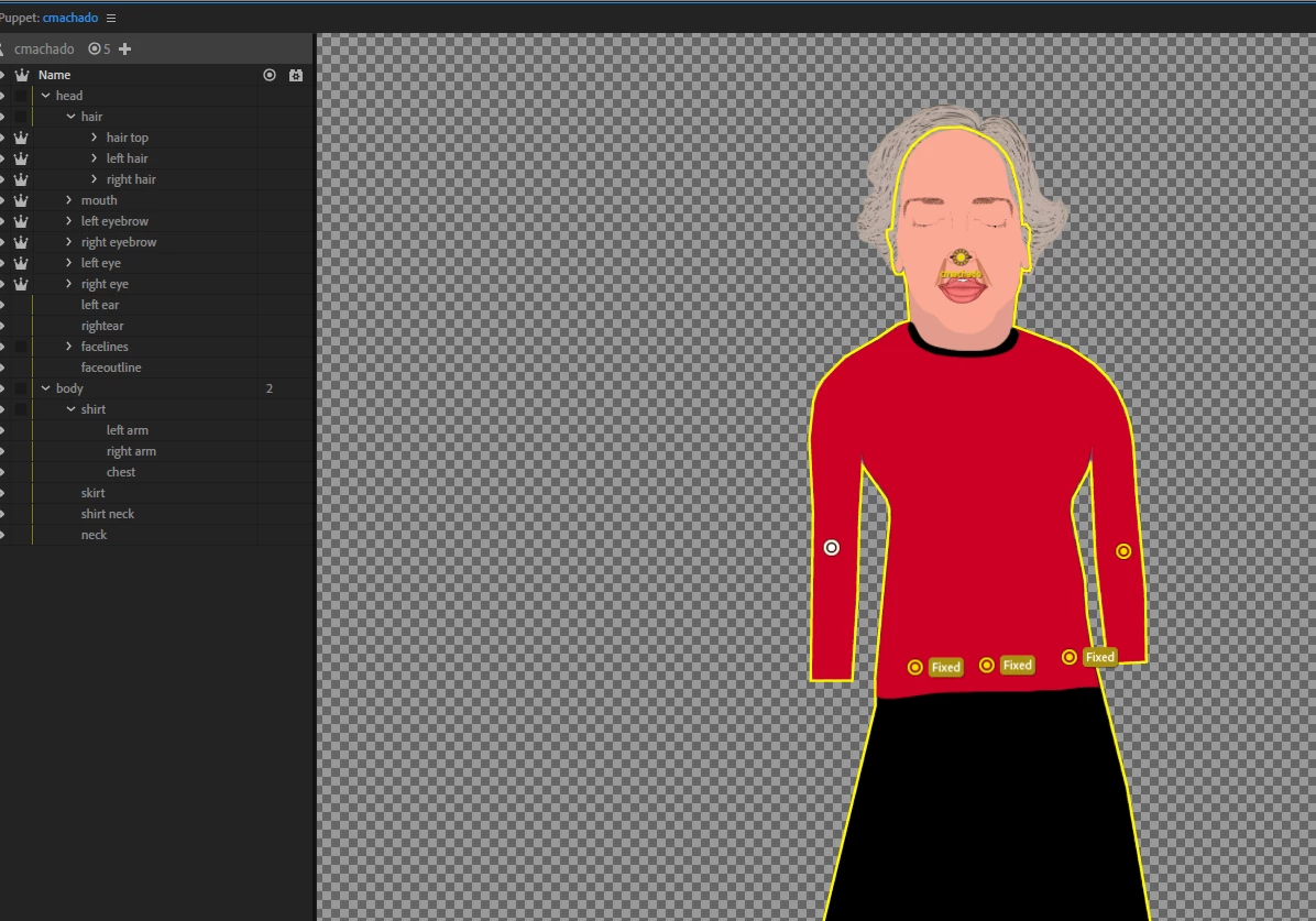 I created this puppet in Illustrator. I have tried several approaches to the problem of the hair becoming crushed when I put her on stage.