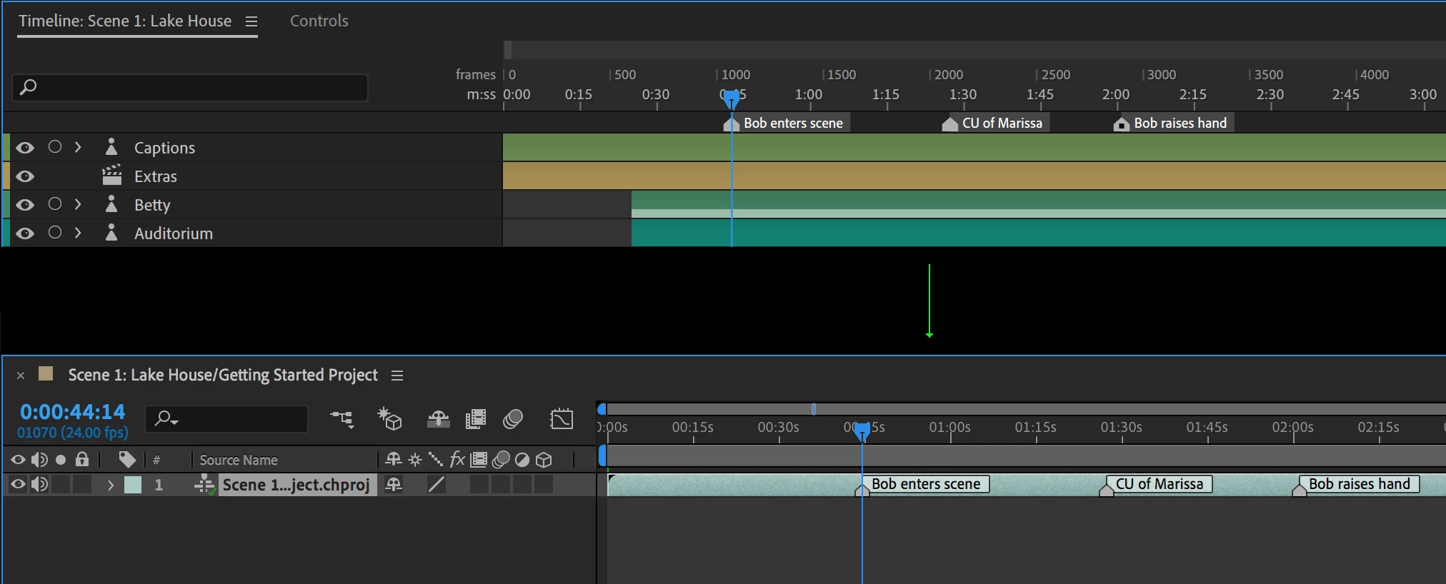 Tip: If you make changes to the scene's markers in Character Animator, refresh the markers in After Effects by right-clicking above a composition marker and then choosing Update Markers From Source.