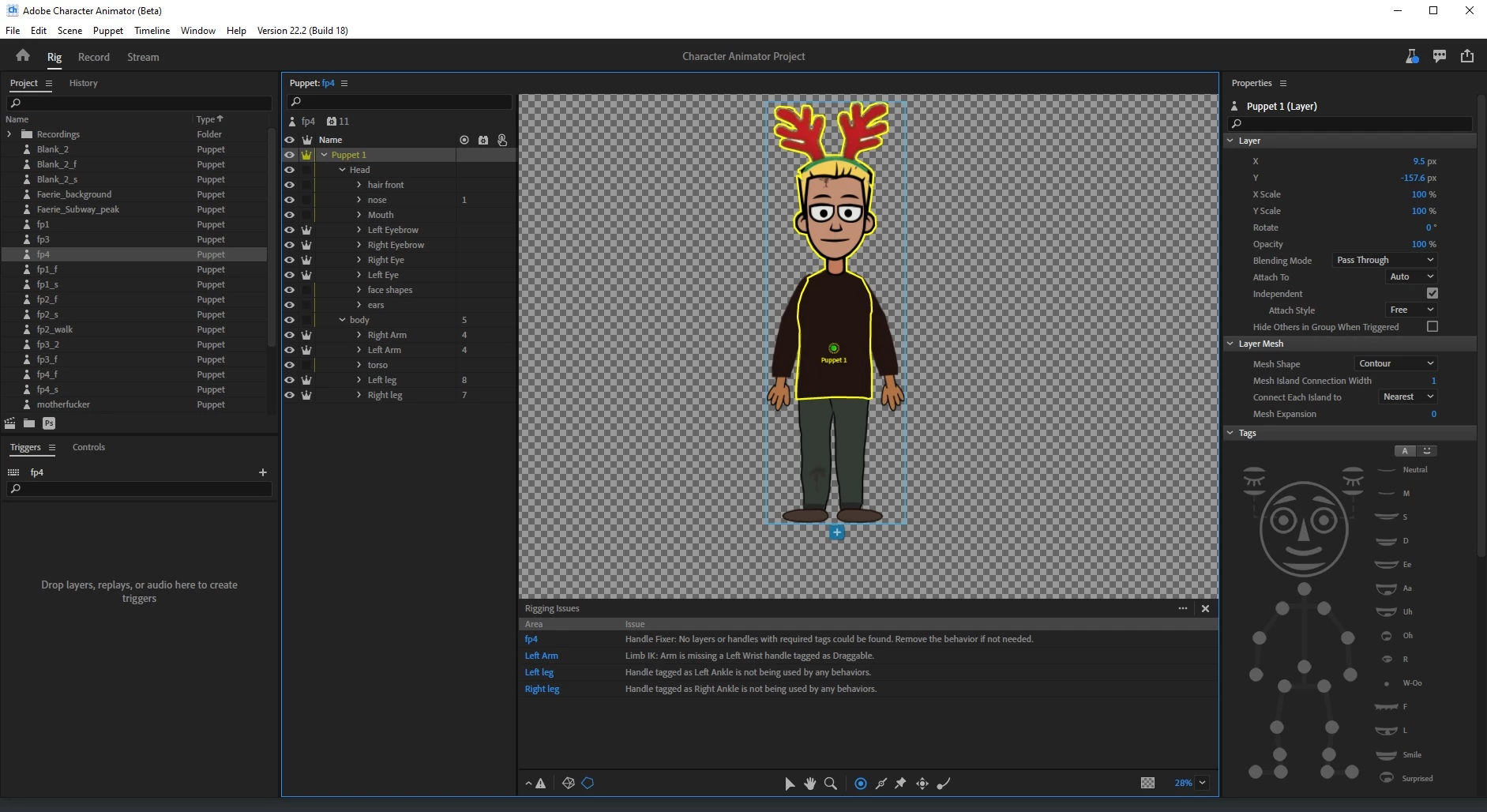 So far, this has resolved the issue in the FP4 puppet. Of course, these solutions may well be because I completely mucked up some element of puppet design or implementation.