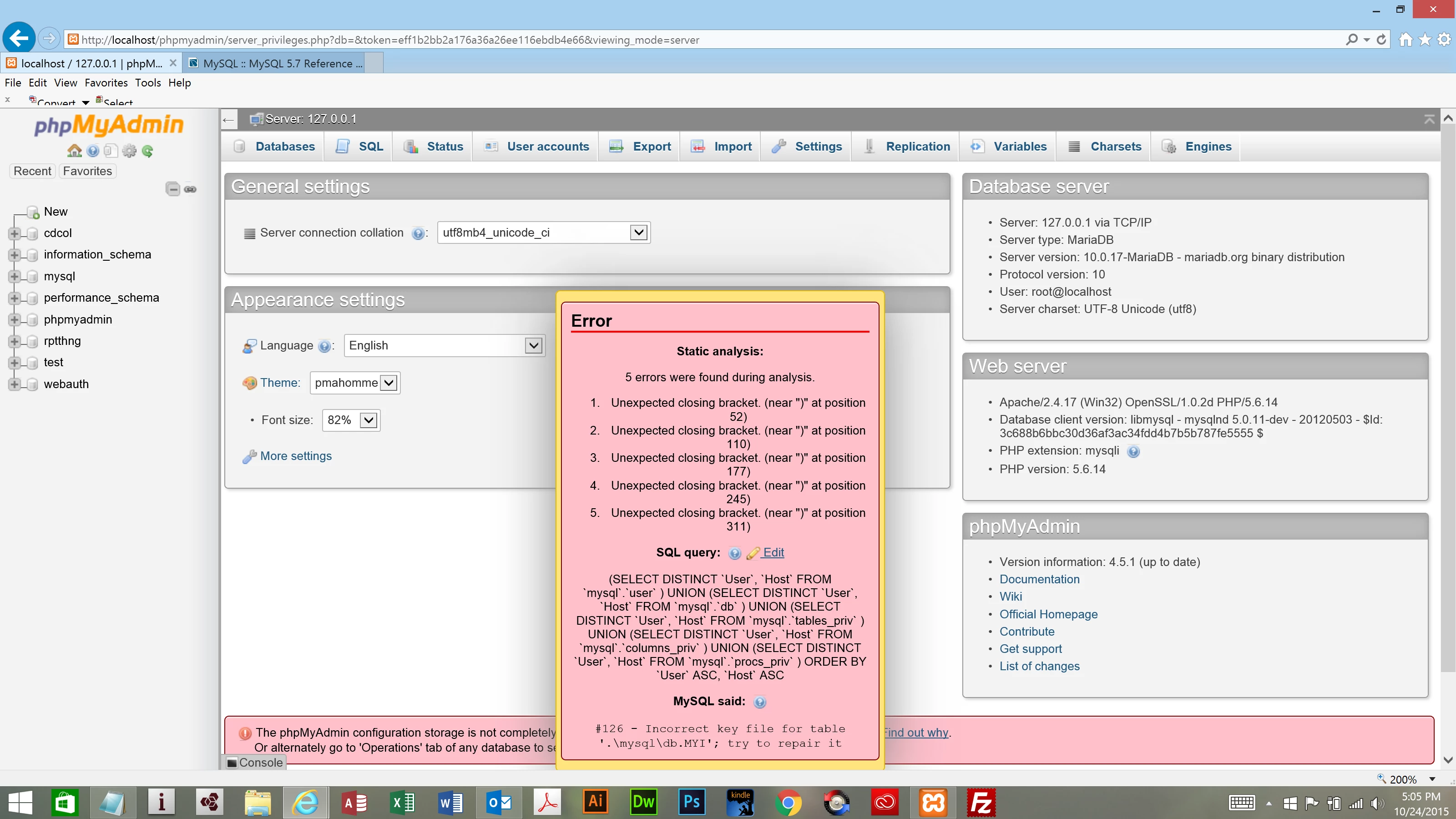 I started an issue thread at GitHub SQL Error Opening User Accounts phpMyAdmin Version 4.5.1 Server version: 10.0.17-MariaDB · Issue #11602 · phpmyadmin/ph… and lem9, one of the phpMyAdmin developers, noted the table db in database MySQL was corrupted and I was unable to repair it. Moreover, lem9 pointed out his demo at demo.phpmyadmin.net / phpMyAdmin demo - MySQL | phpMyAdmin 4.6.0-dev did not have this problem I'm dealing with.