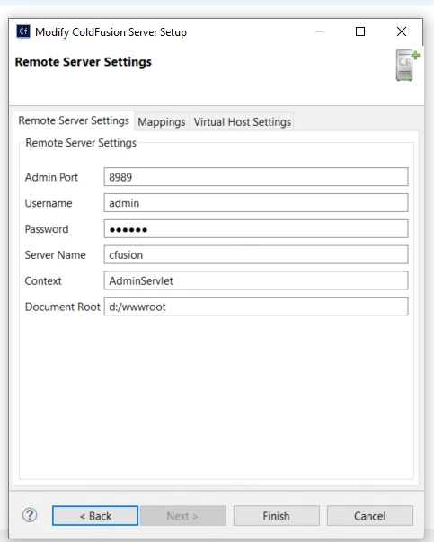 I have set up local and remote CF servers in every possible way I can think of but when I set up my application to use a server the error is always the same. Here are my last 2 server setting, one local, one remote.