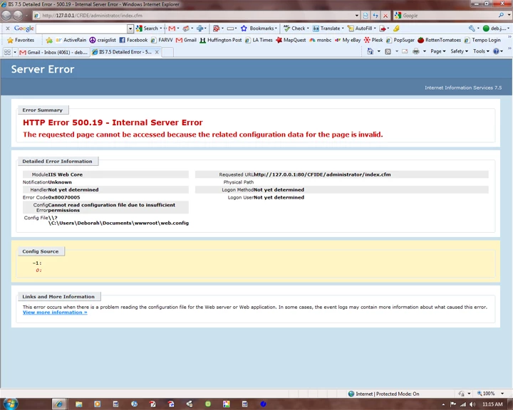 Hi, I just installed Cold Fusion Development Edition on my Win 9, 64 bit computer with IIS. When I try to go to my CF administrator I get the error message in the subject. I am not using the default website but I configured a new website mapped to my custom wwwroot. I deleted the default webserver and installed cold fusion to the new website. Any ideas? Thanks.