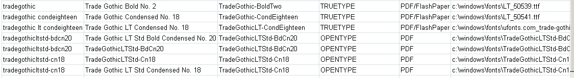 Of all the TradeGothics listed above, the TrueTypes get completely ignored. The OpenTypes cause CF to crash with this error: